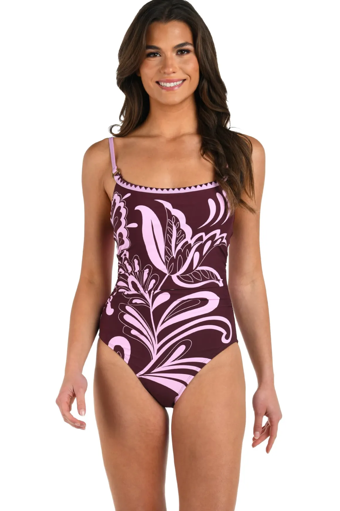One piece swimsuit features oversize floral and leaf motifs, scoop neckline, adjustable straps with ring details, removable cups and shirred body with tummy control. Offers moderate bottom coverage.