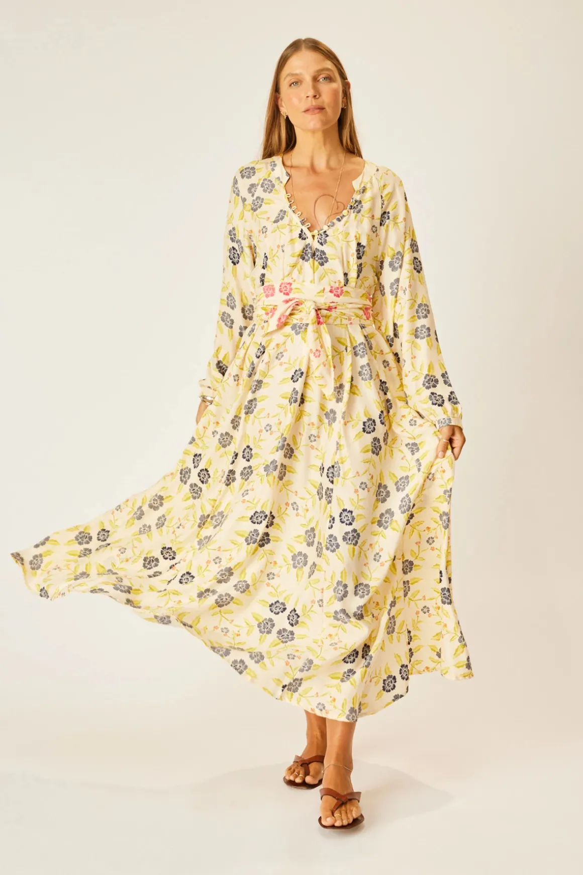 Fiore A-line maxi dress features v-neckline with covered buttons and voluminous long sleeves.