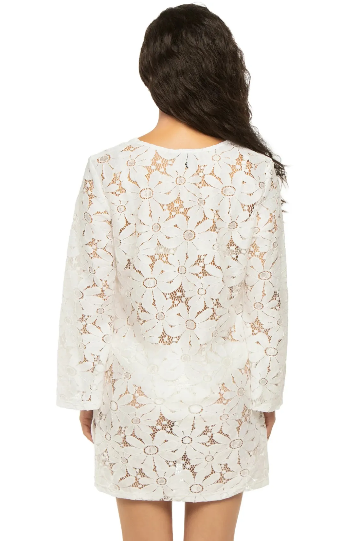 Tunic features floral crochet, a scoop neck and long bell sleeves.