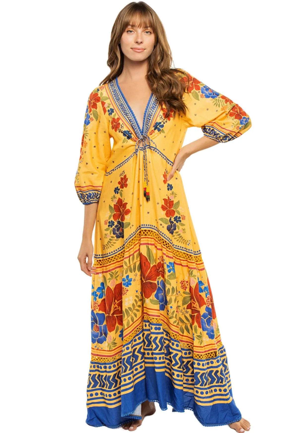 Floral Yard maxi dress features a V-neckline with pom-pom trim and ring tunneled ties.