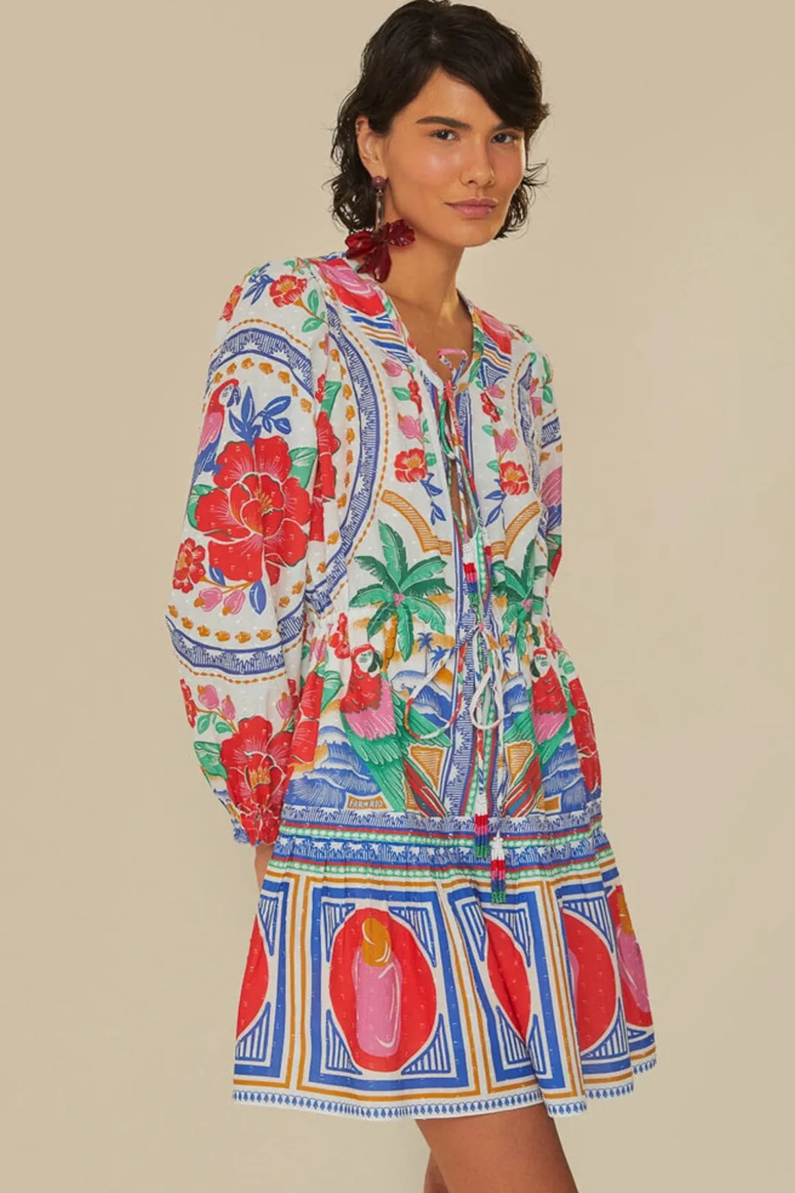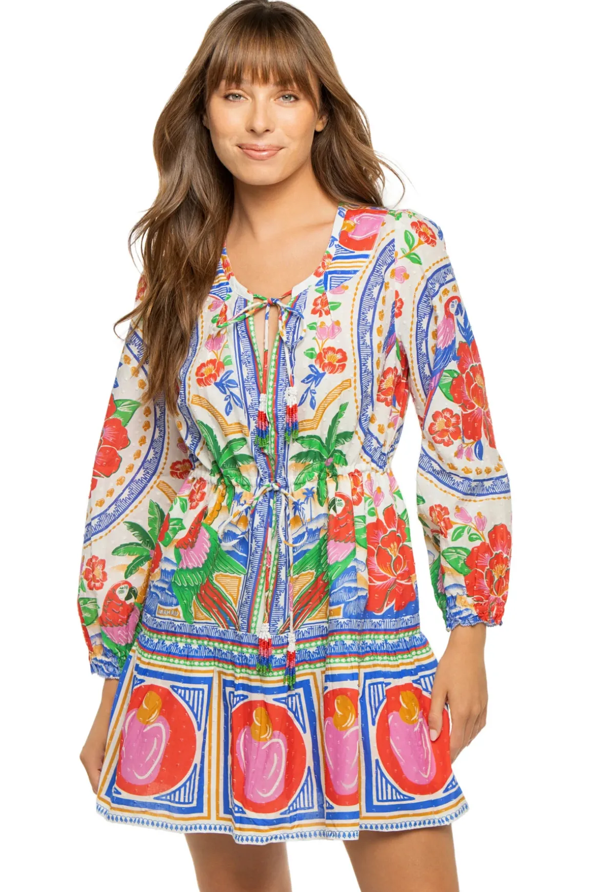 Mini dress features a bold tropical floral design, round neckline, and soft bell sleeves with a ruffled hem. Offers a cinched waist with drawstring ties.