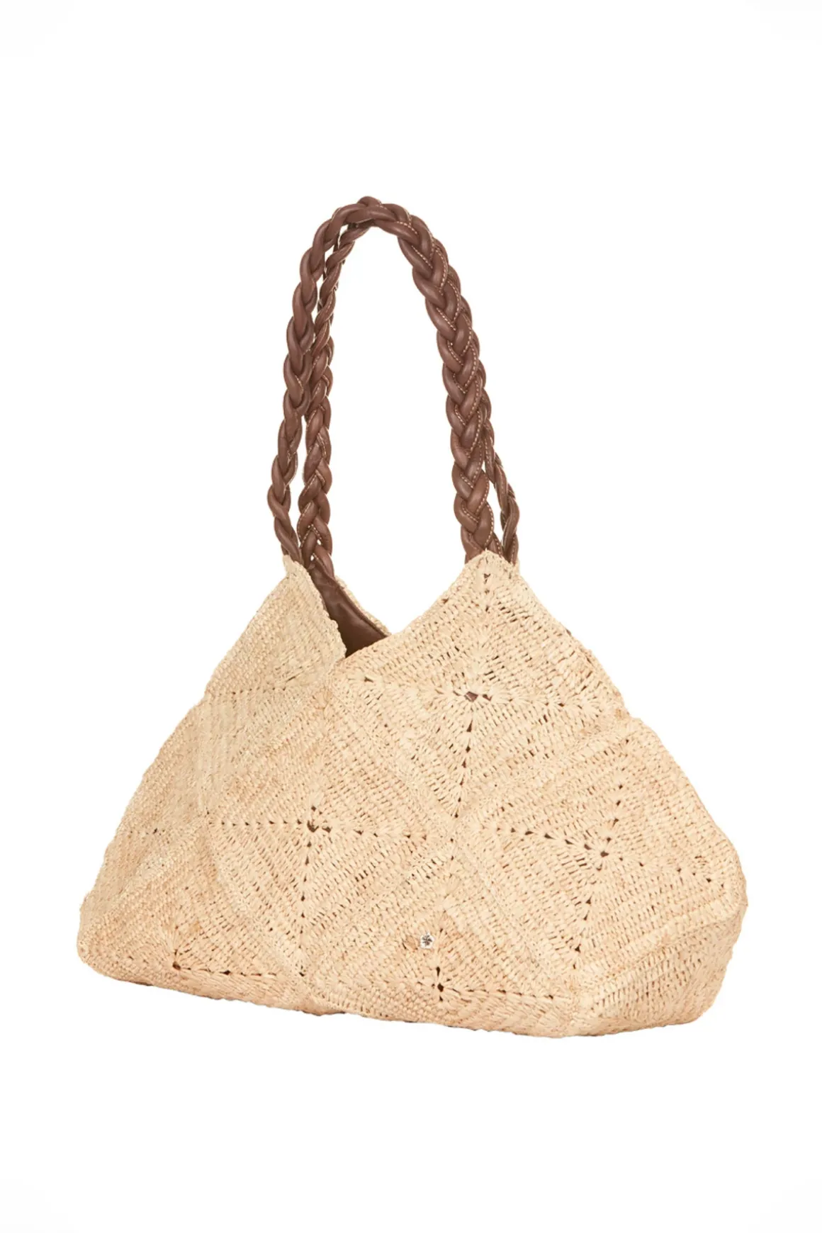 Foggia tote bag features woven raffia and braided leather straps.