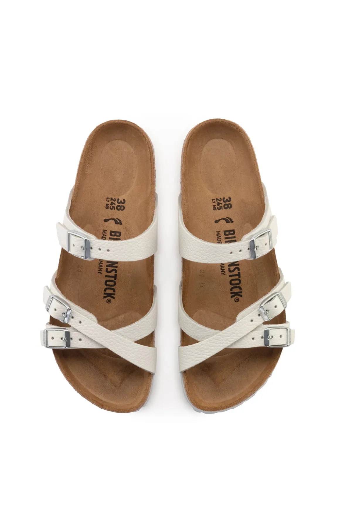 Franca slides combine timeless design with legendary comfort, featuring a cork latex footbed, a natural leather upper with three straps each adorned with an individually adjustable metal pin buckle and a flexible, lightweight EVA sole.