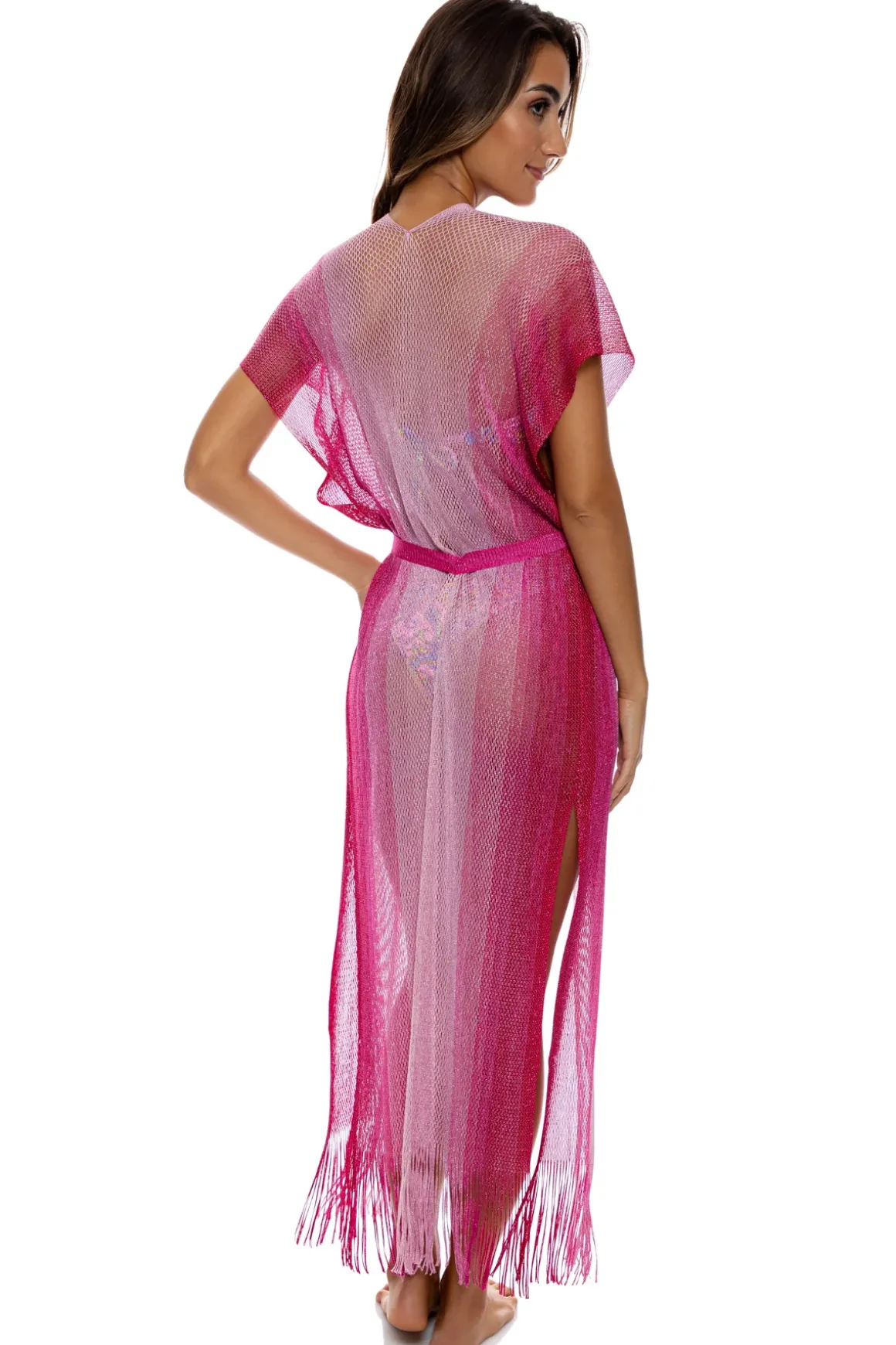 Caftan style kimono features high side slits with an adjustable waist belt, short airy butterfly sleeves and a playful fringe hem.