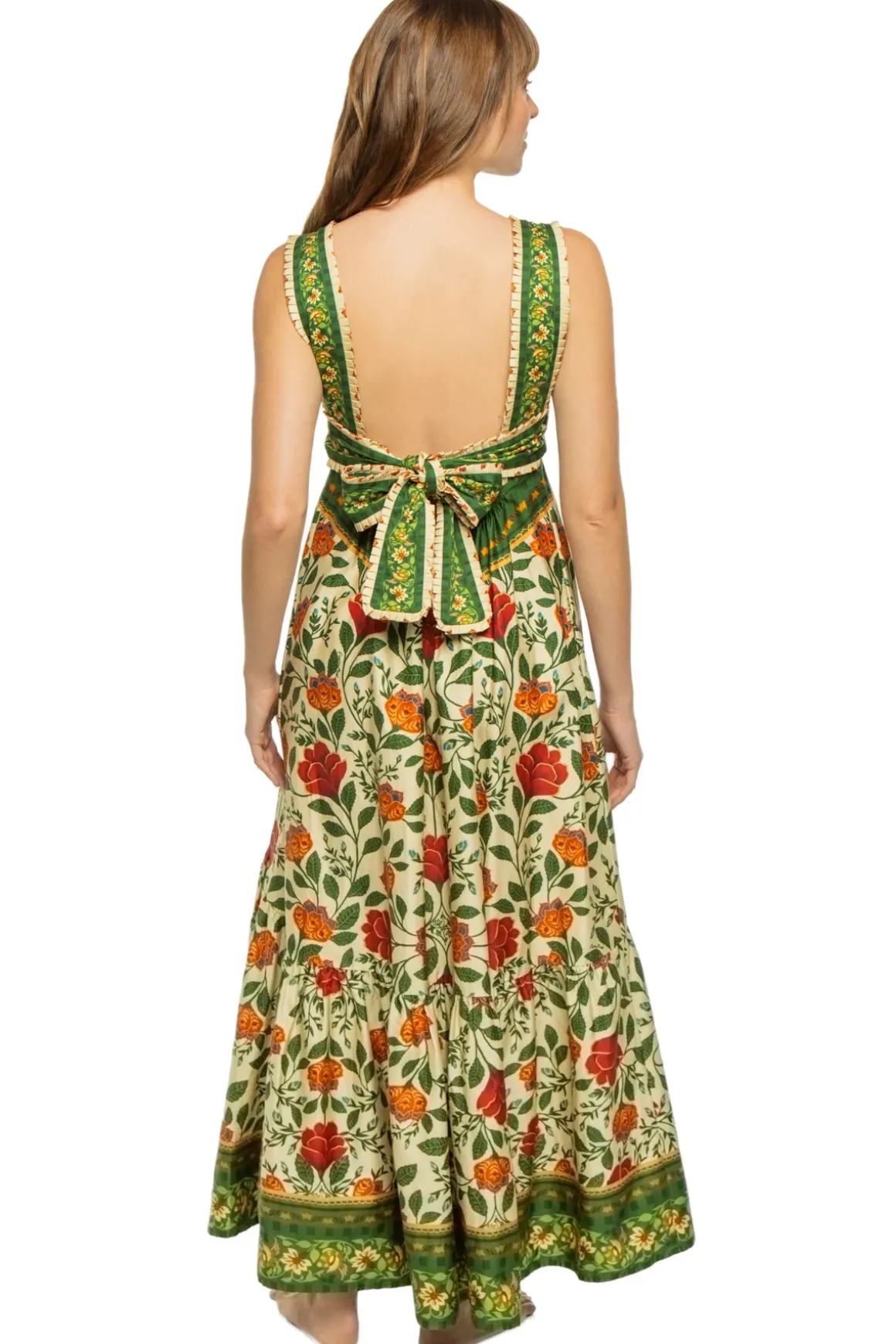 Maxi dress features tapestry floral print, square neckline, button front, and tie detail at back.