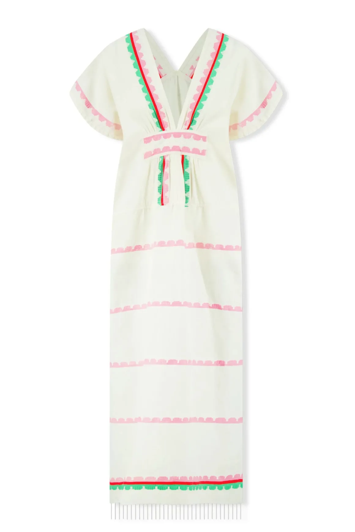 Gasira handwoven caftan features plunge neckline, kimono cap sleeves and gathered empire waist.
