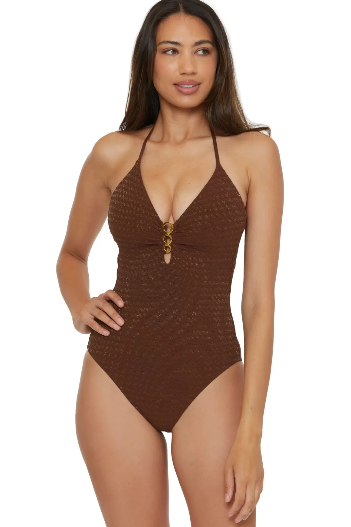 One piece swimsuit features textured shimmer fabric and plunge neckline with gold tone hardware. Offers adjustable halter ties, removable soft cups, and a tie back closure.