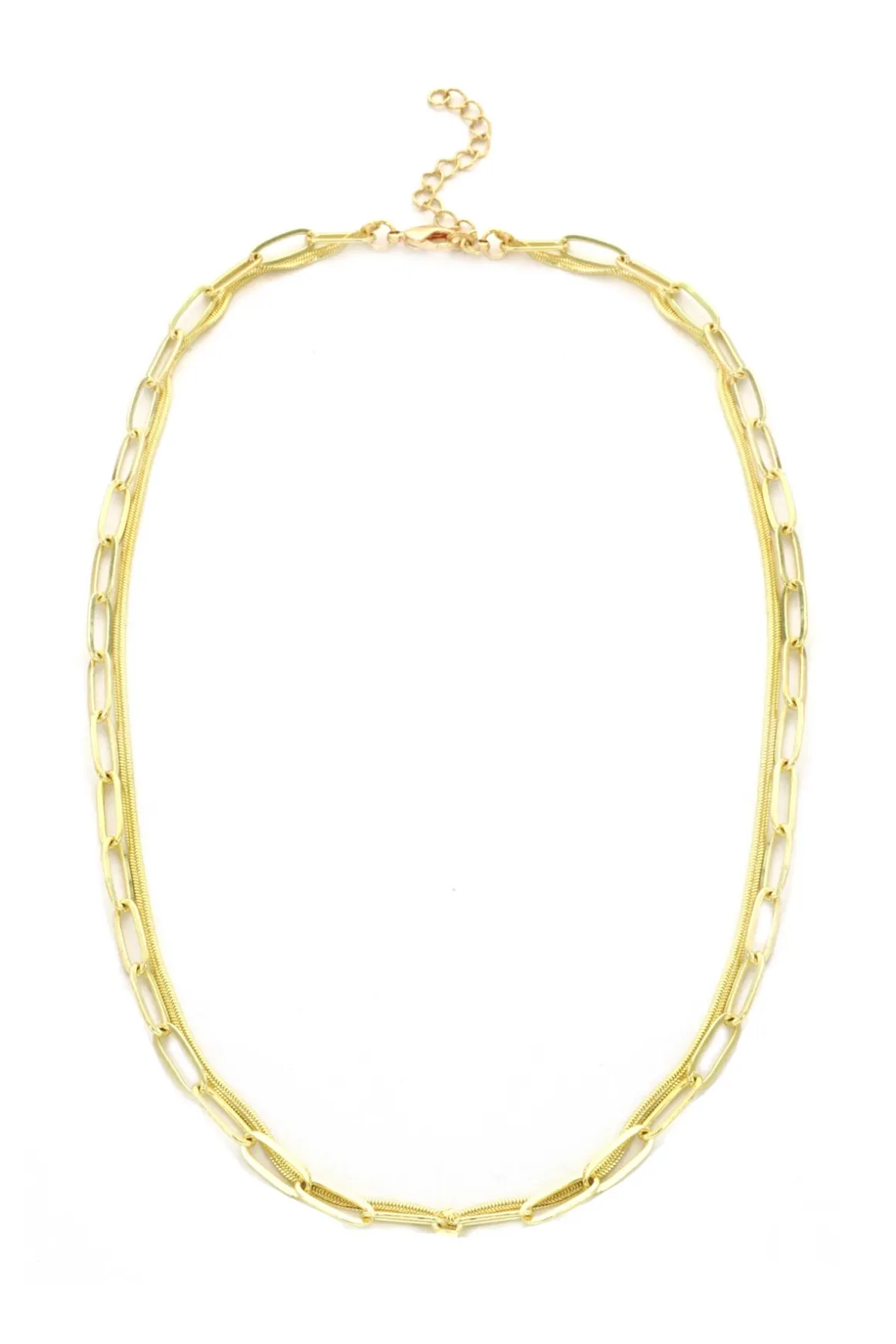 Necklace features two interlocked gold plated brass chains with a lobster clasp closure.