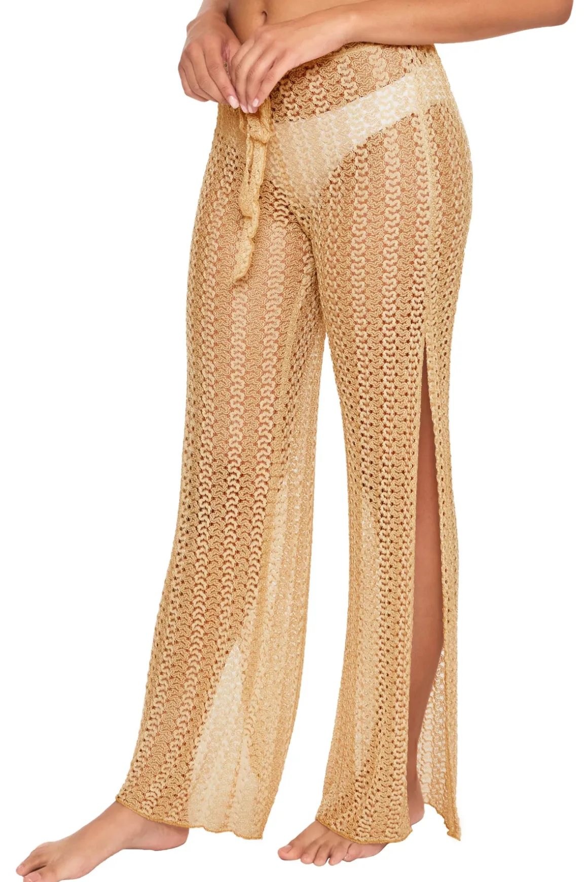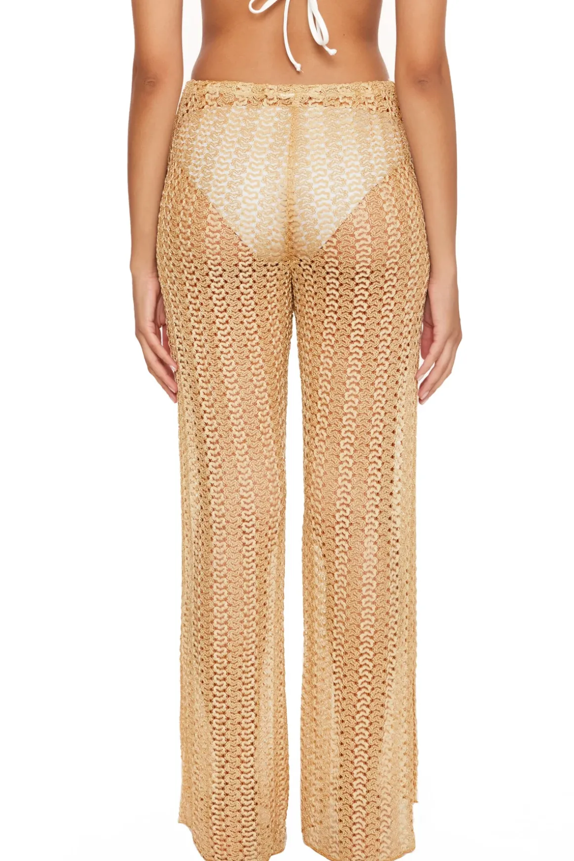 Golden sheer pants feature an intricate textured design with metallic accents and offers side slits and a drawstring waist.