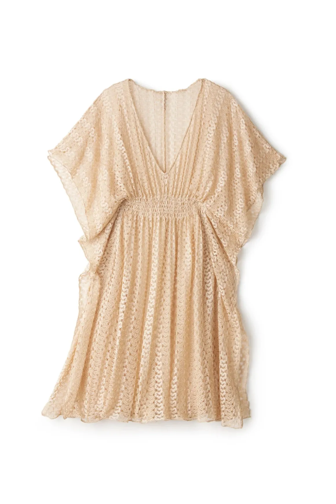 Golden metallic tunic features an intricate textured design with metallic accents and offers flutter sleeves with side slits and a plunging neckline.