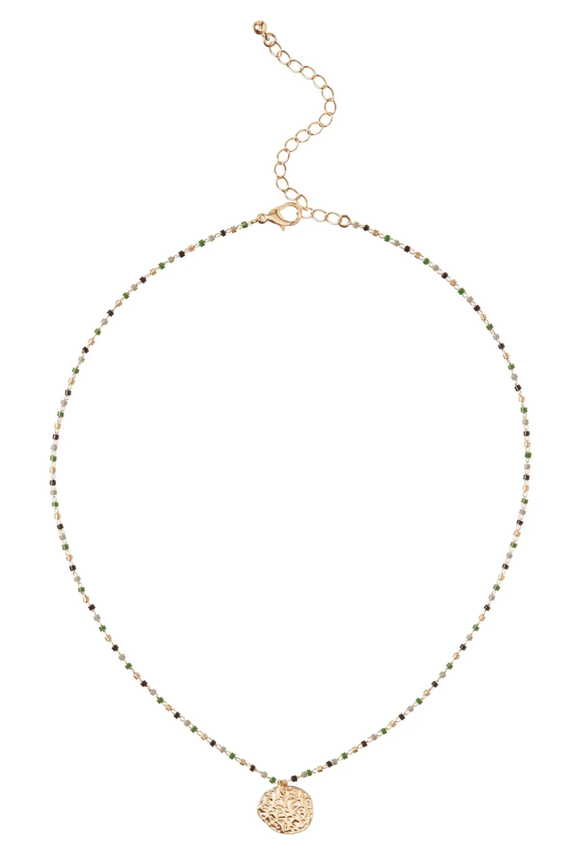 Mini necklace features a multi color beaded chain with a gold tone pendant and lobster clasp closure.