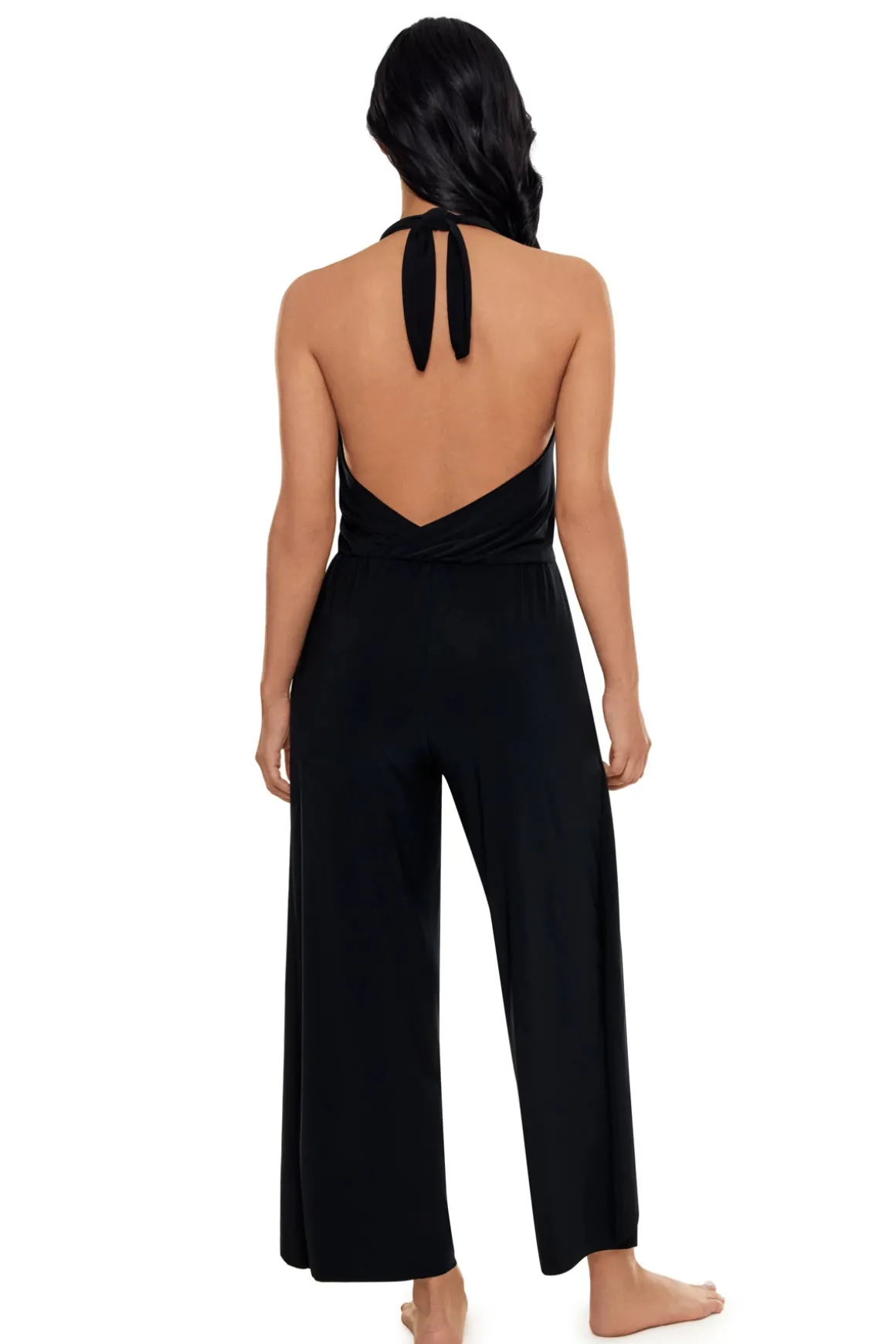 Jumpsuit features a plunging neckline, wide halter straps and pockets.