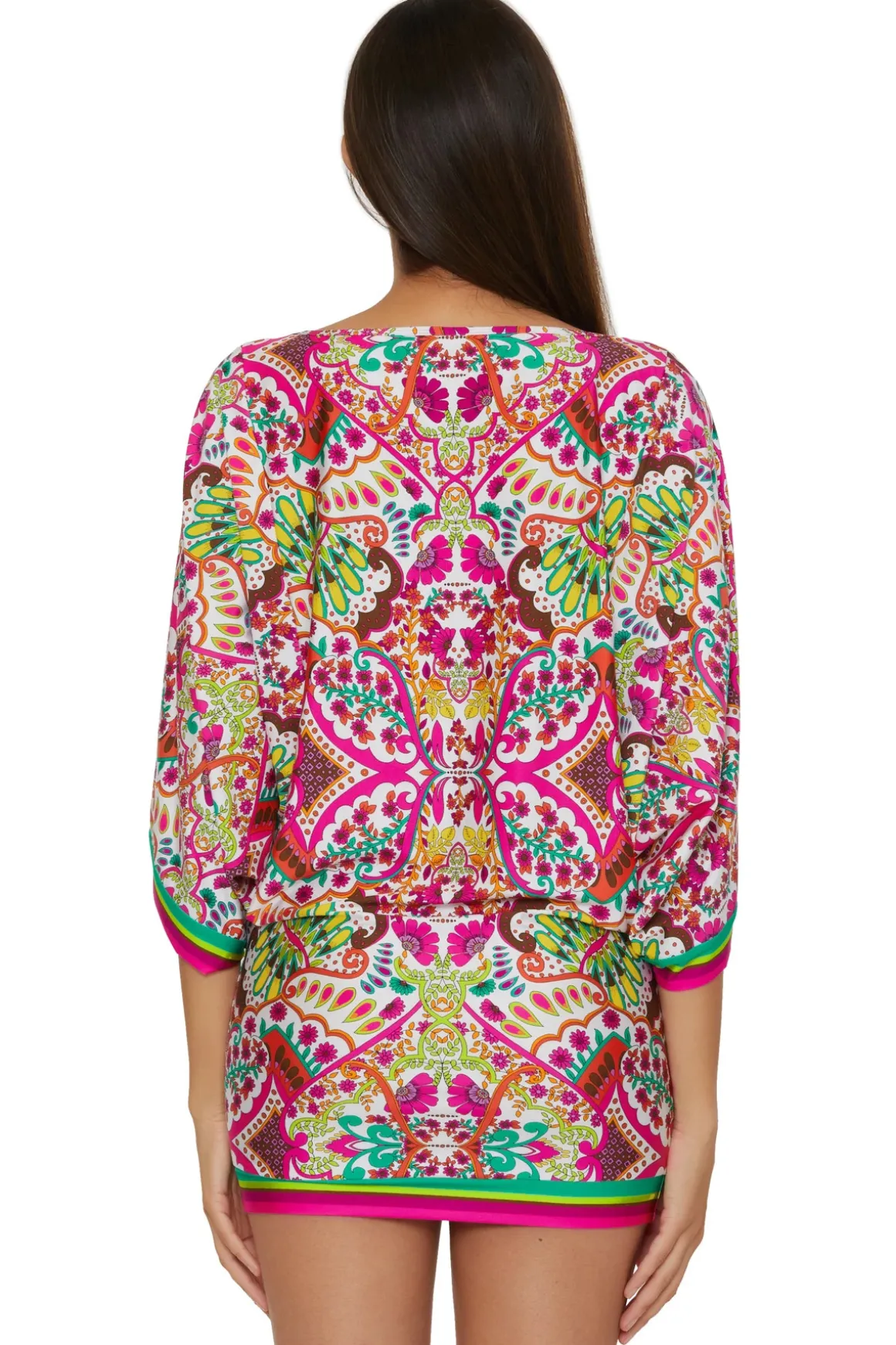 Tunic features bright floral print trimmed with contrasting horizontal stripes, flounce sleeves and is fitted at hips. Can be worn as a swim cover up, a mini dress or as a top.