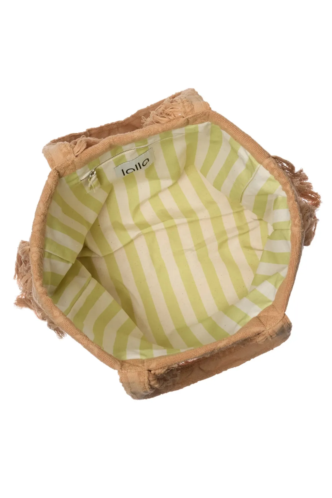 The Hippy Lagoon Eponge tote is a stylish beach bag made of cotton towel material featuring playful fringe detail, sturdy double top handles, and an interior zip pocket. Fully lined with African wax fabric, design and linings may vary.