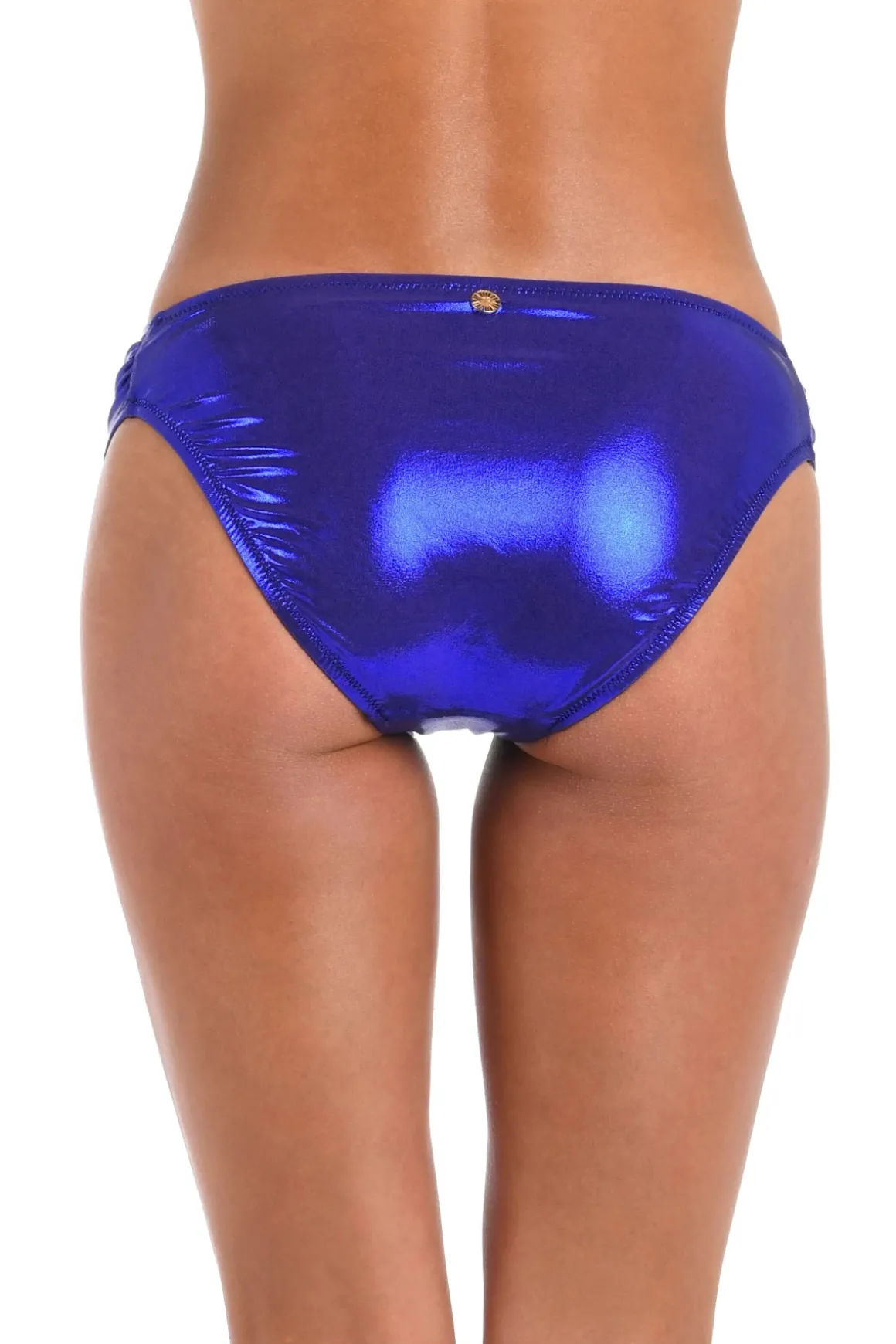 Metallic bikini bottom features shirred tab sides and offers moderate coverage.
