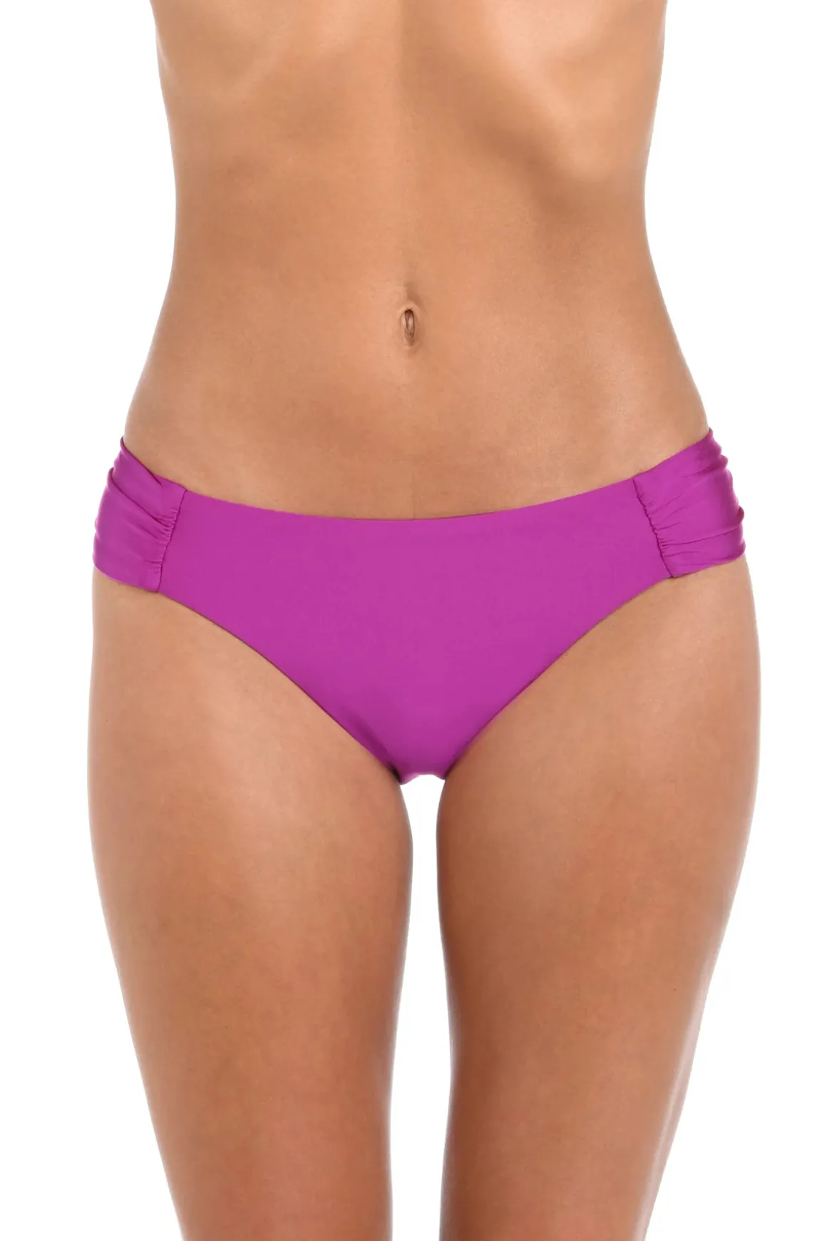 Hipster bikini bottom features shirred tab sides and offers moderate coverage.