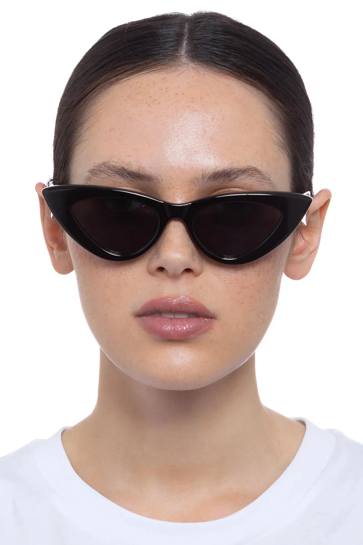 Hypnosis cat-eye sunglasses with smoke mono polarized lenses feature a thick black frame. Le Specs protective pouch and microfiber cleaning cloth included.