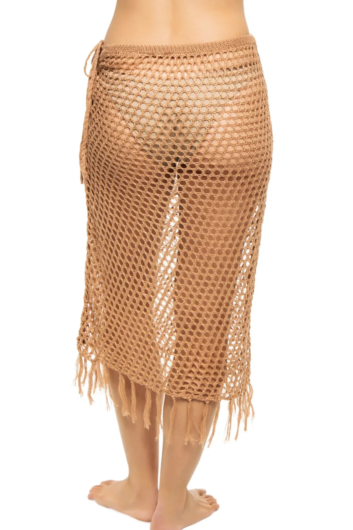 Ibiza sarong features open weave crochet with a fringe hem and side tie.
