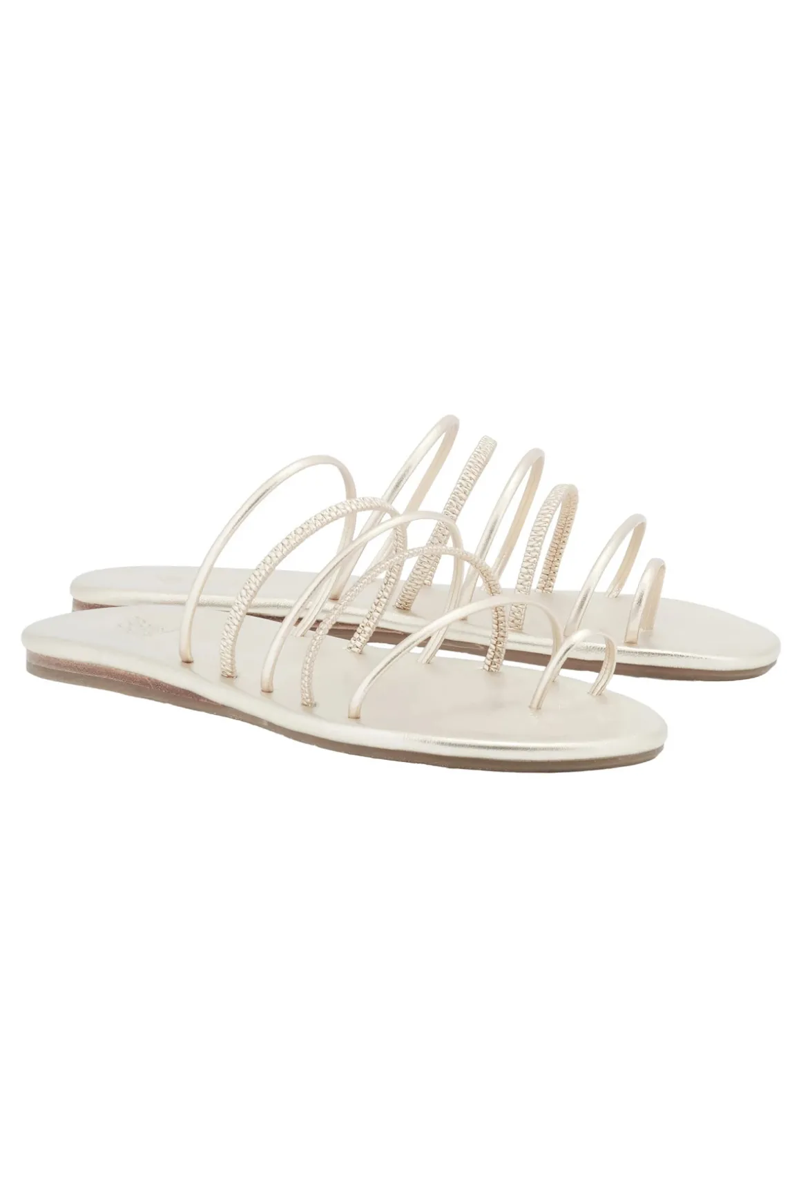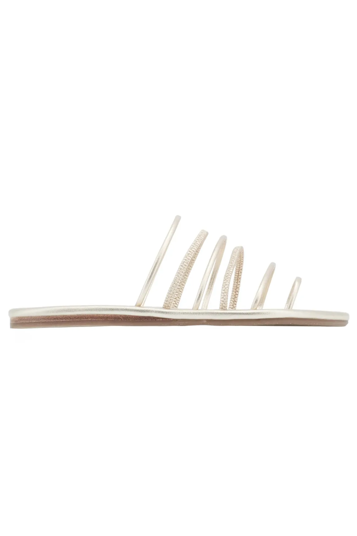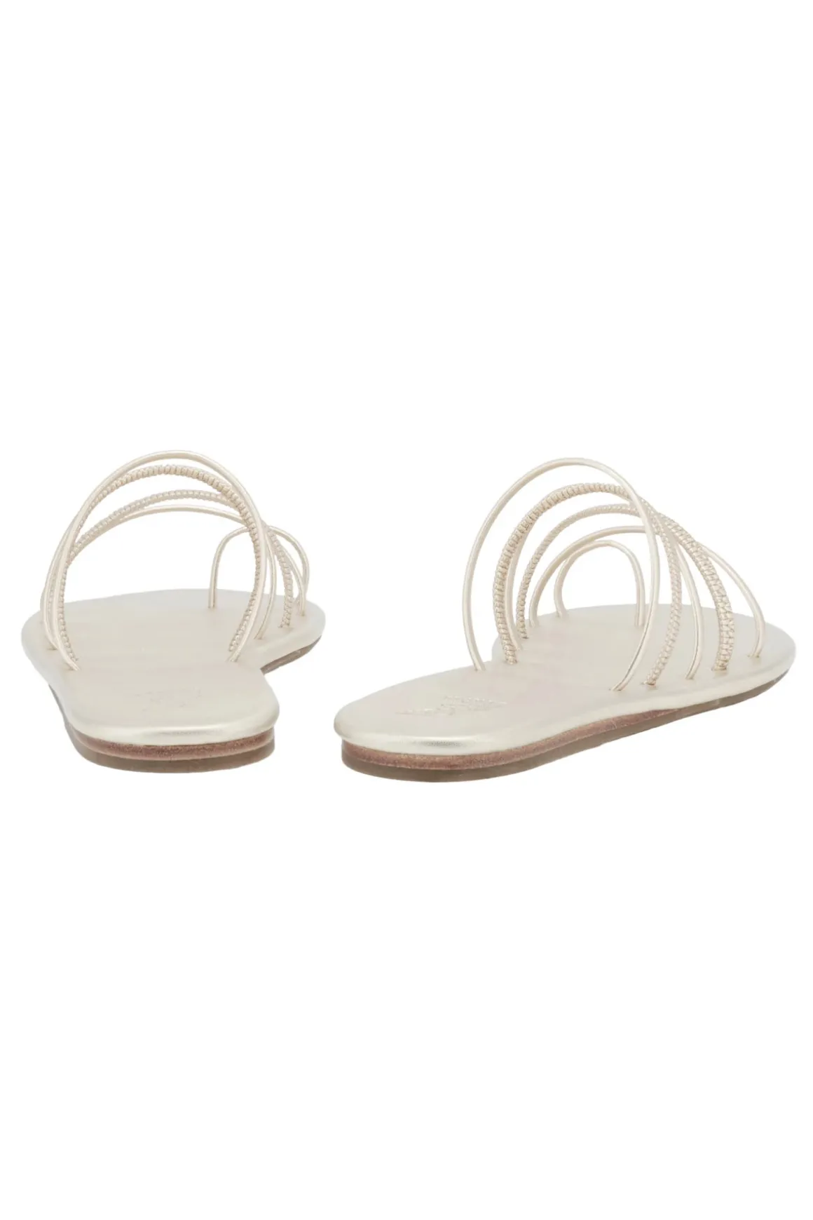 Imatio slides feature thin metallic straps, perfect for beach outings or elegant occasions. Handmade in Greece.