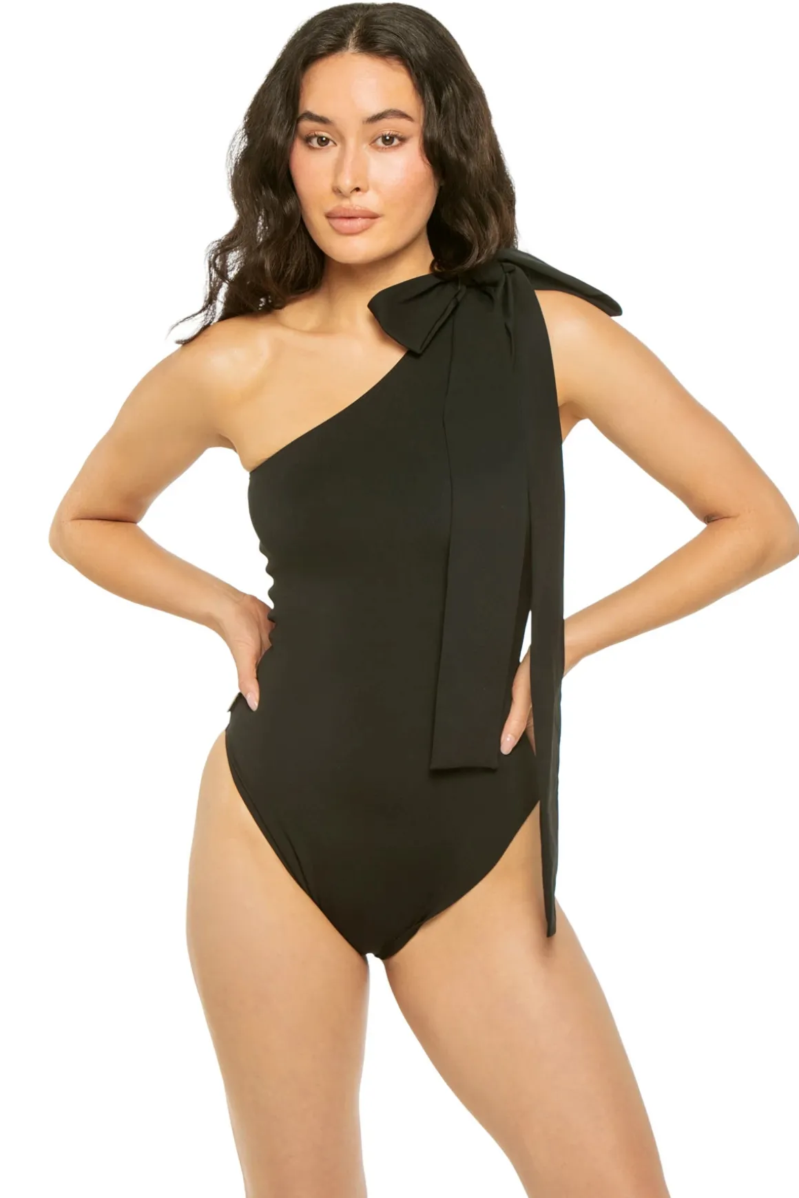 Intemporel one piece swimsuit features an elegant and bold neck scarf that can be worn as a bow. Offers skimpy bottom coverage.
