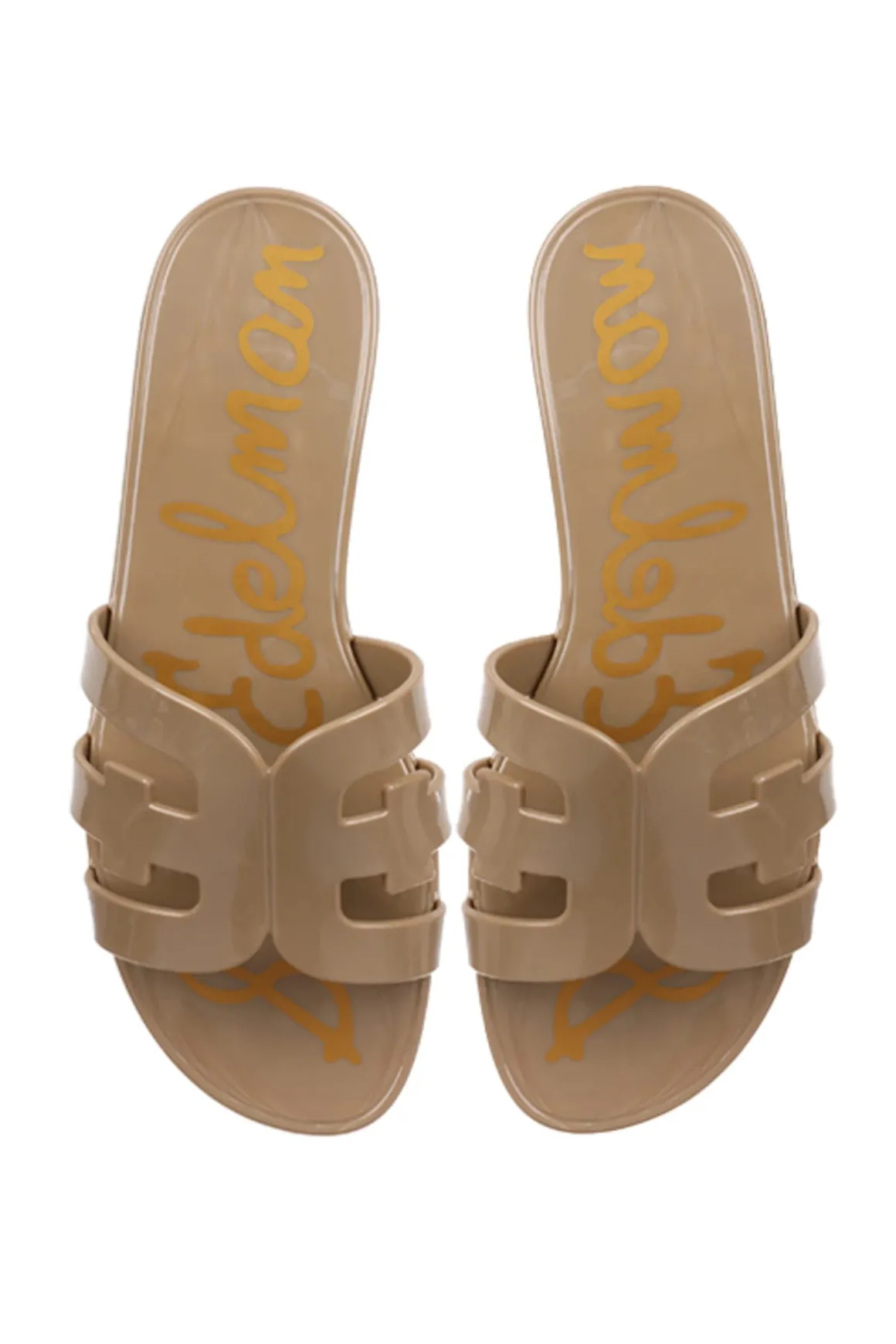 Irina slide features the brands signature double-E logo, PVC footbed, a jelly sole and a slightly elevated heel.