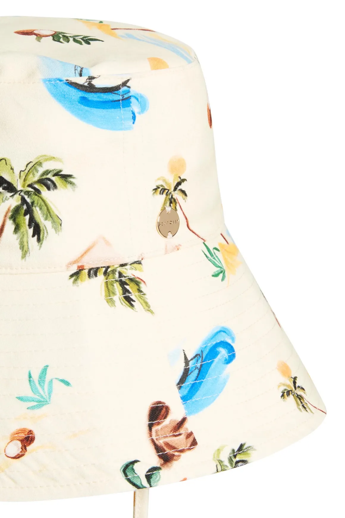 Bucket hat features tropical print and adjustable head ties for a secure fit.