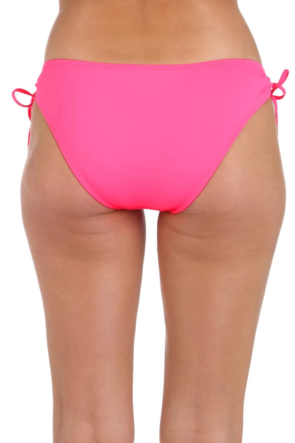 Hipster bikini bottom features adjustable loop tie sides with bullet cord ends and offers moderate coverage.
