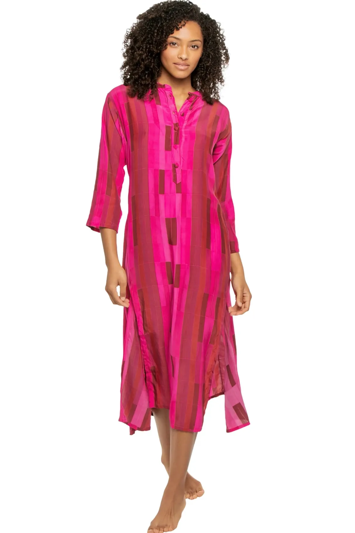 Isobel maxi dress features a striped colorblock pattern, collarless neckline and button up front.