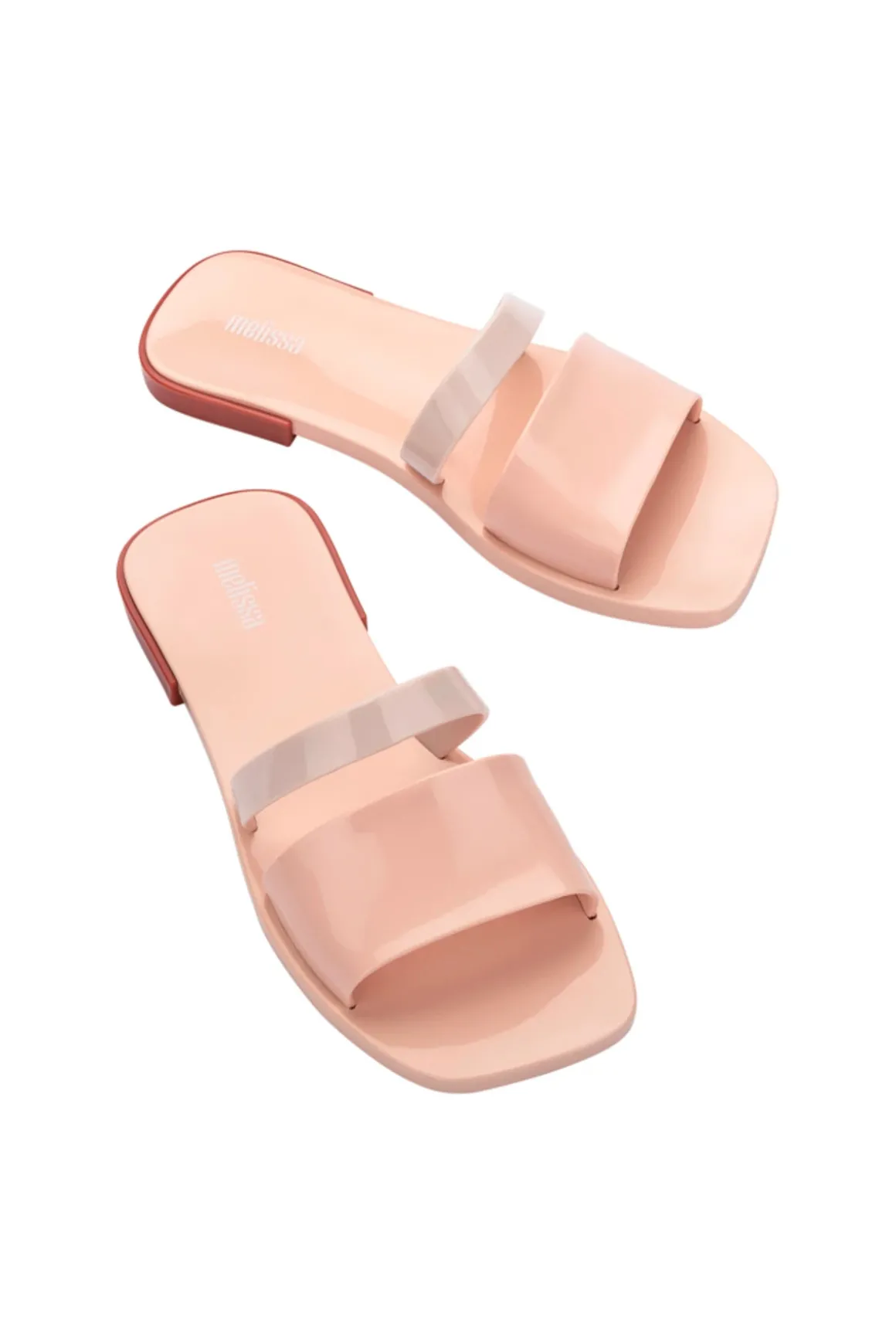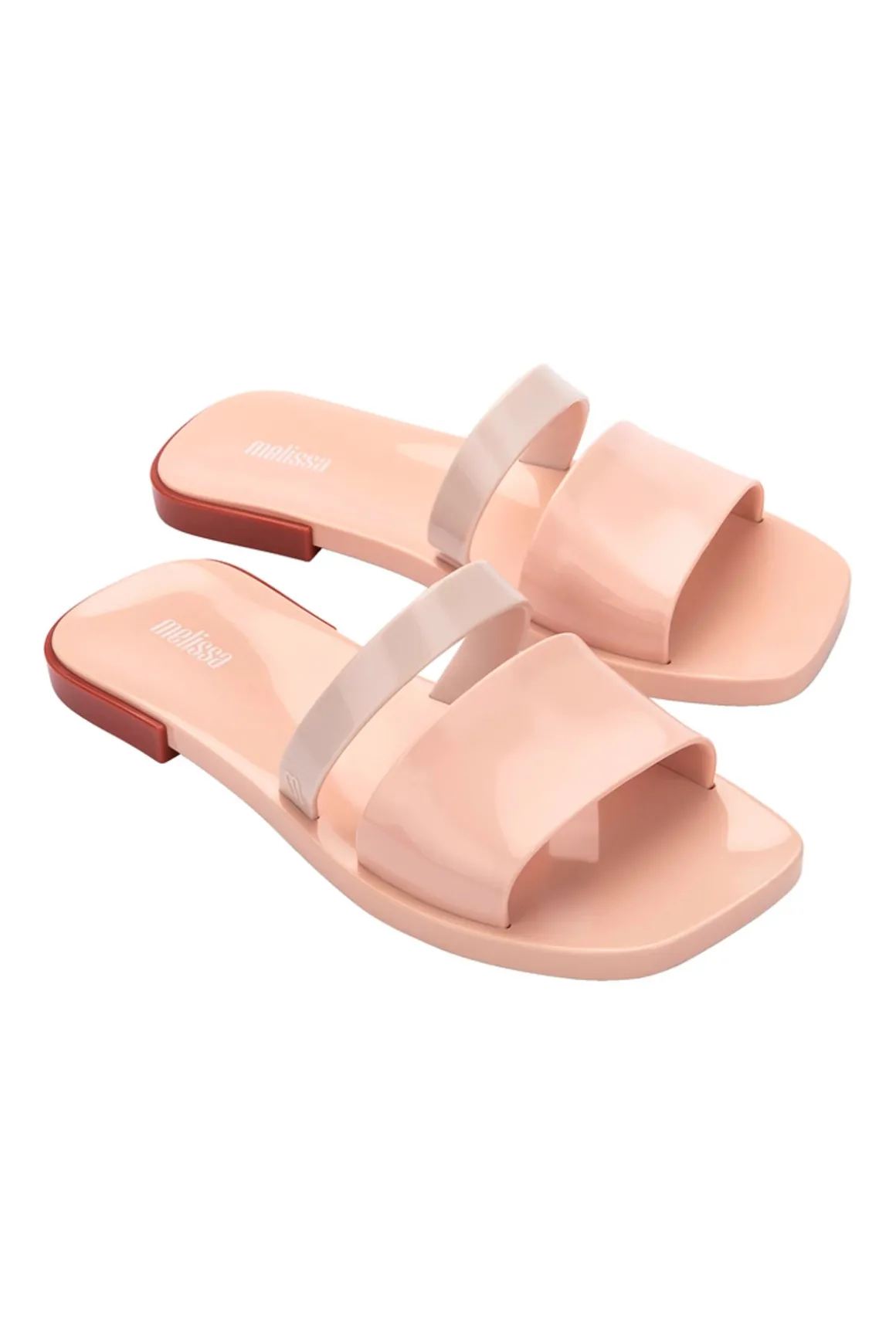 Ivy slides feature a signature bubblegum scent, two-tone color, asymmetrical straps and a low heel.