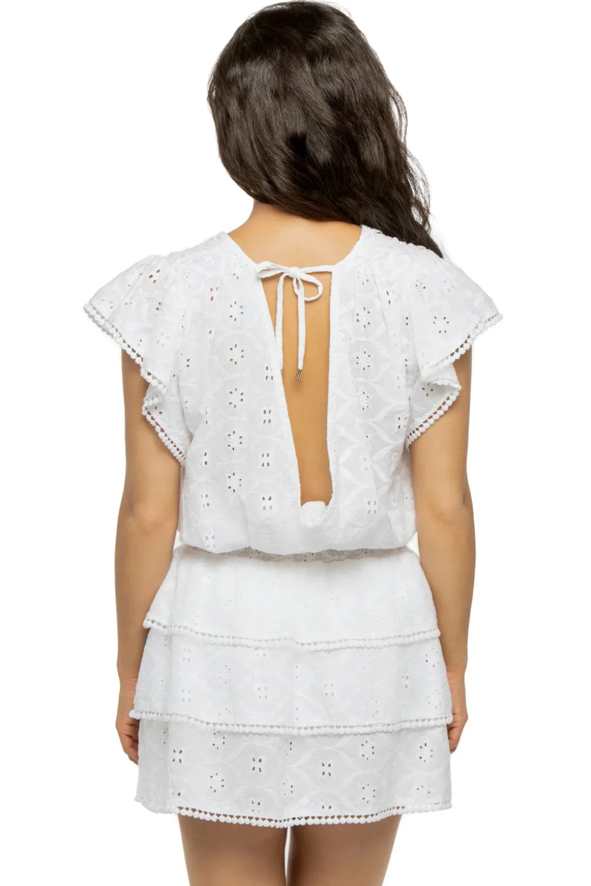 Jess mini dress cut from a broderie anglaise fabric features a plunging neckline and a smocked waist. The ruffle tiered skirt is finished with delicate crochet trim. Ties at the back with signature golden branded cord-ends.