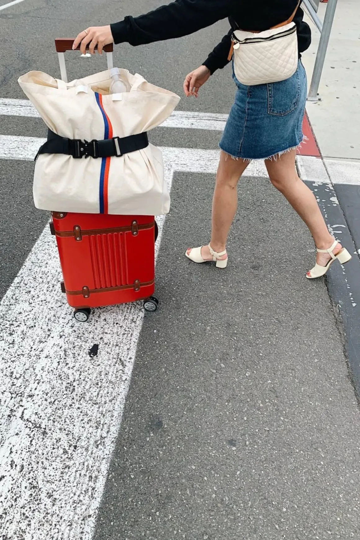 A travel belt that will keep your bag in place until you need it, featuring vegan leather and a herringbone patterned nylon. Offers a quick release buckle and an elastic fitter for an extra tight hold.