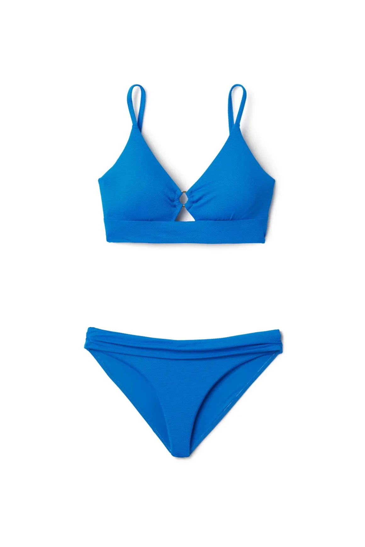 Bralette bikini top features ring detail at front. Offers a personalized fit with removable soft cups, adjustable back straps and double hook back closure. Power mesh provides additional lift and support. Tailored to fit bra sizes 30C to 38F.