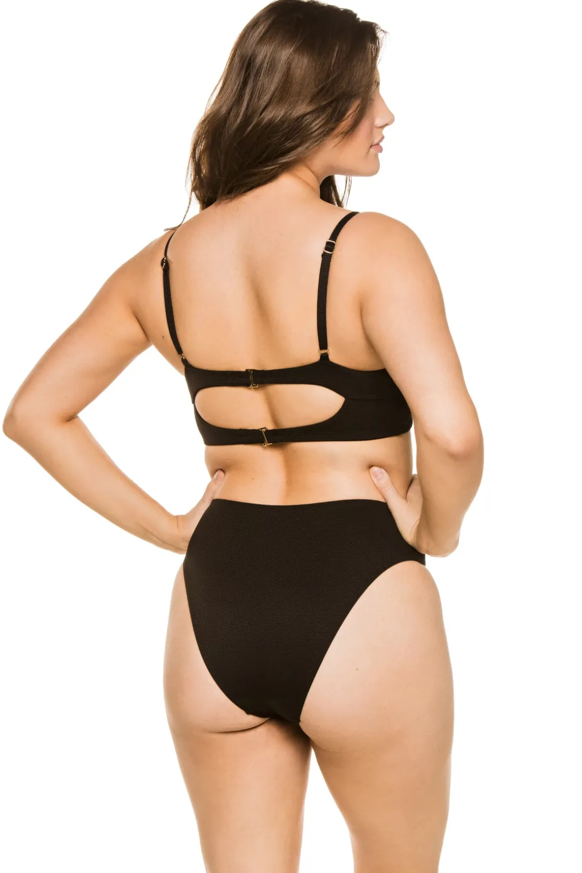 Bralette bikini top features ring detail at front. Offers a personalized fit with removable soft cups, adjustable back straps and double hook back closure. Power mesh provides additional lift and support. Tailored to fit bra sizes 30C to 38F.
