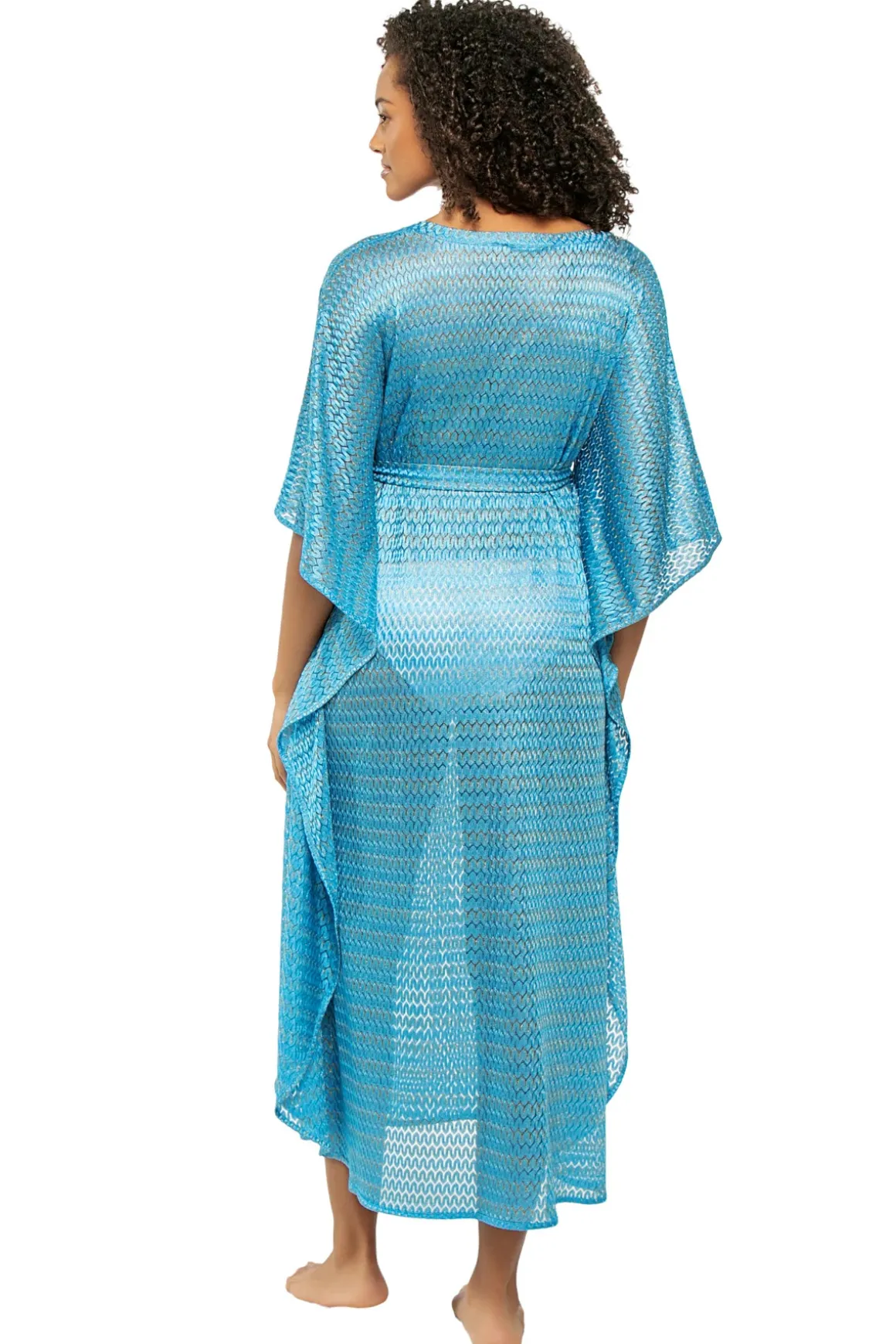 June caftan features a shimmering lightweight crochet fabric with metallic gold thread woven throughout. Offers batwing sleeves and side slits for added style and comfort.