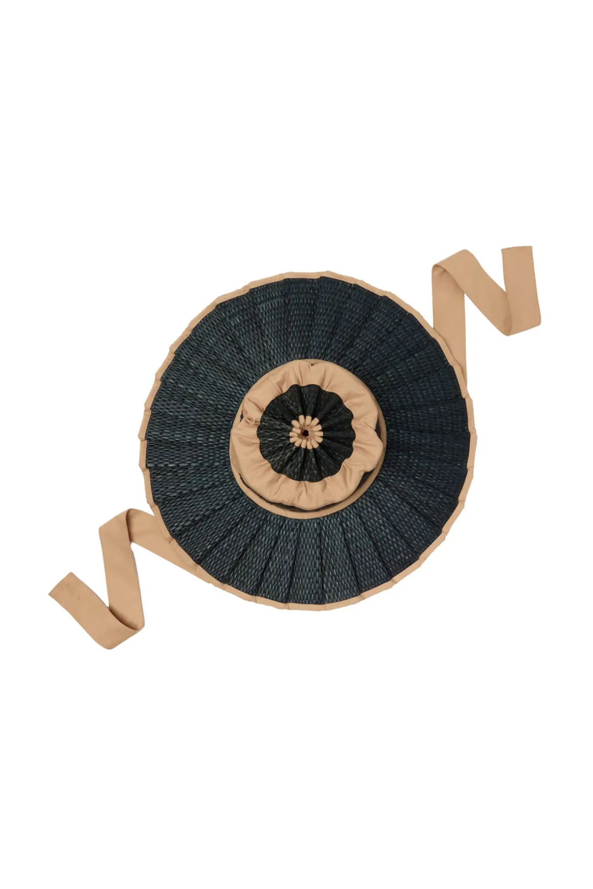 Kapolei Ravello sun hat features a mid-length brim, is carefully handcrafted from 100% natural organic grass fibers, and is specifically designed to collapse and fold like origami due to the sunray pleats for easy packing and traveling. It offers wide ties at the base to anchor it during breezes. This stunning piece is created with ink-black threads woven through liquorice black grass fibers, while the caramel neutral cotton fabric trim elevates its design.
