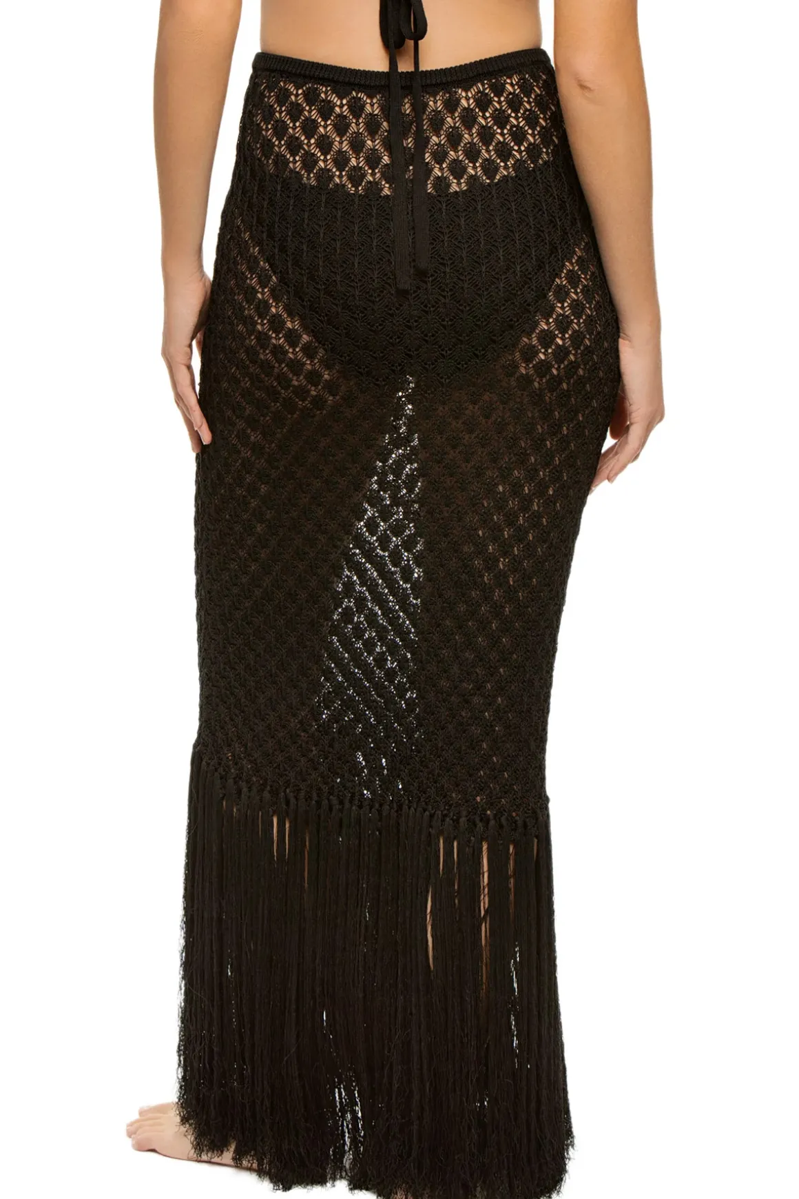 Lacey crochet maxi skirt is finished with a double row of 16″ silky fringe.