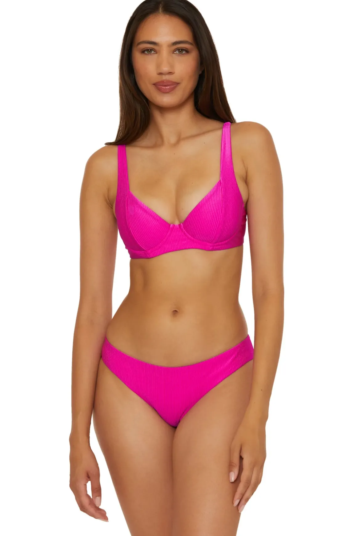 Lana bikini top features shiny ribbed texture, adjustable straps, removable soft cups, supportive underwire and hook back closure.