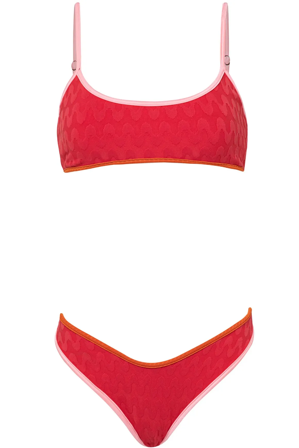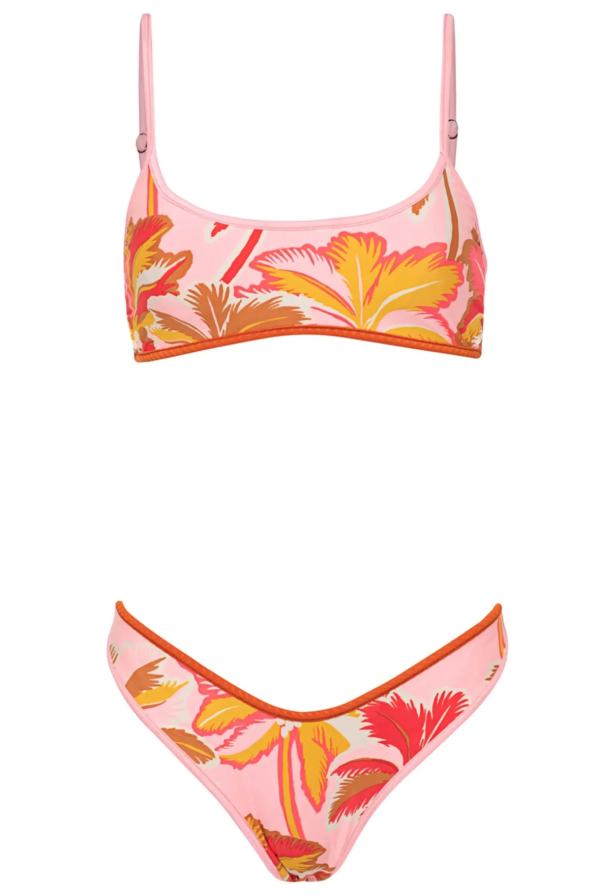 Lane bralette bikini top reverses from a wavy textured solid color to a vibrant tropical print. Offers adjustable straps and removable cups.