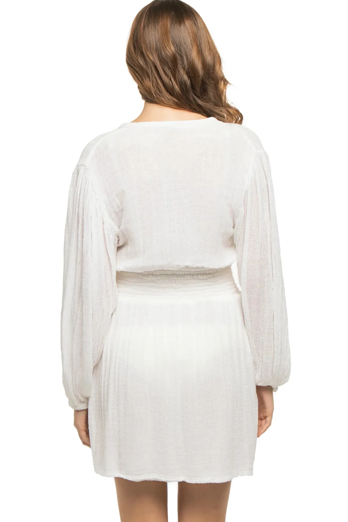 Lapis mini dress features a striking plunging v-neckline, cinched at the waist with a cummerbund-style gathering for a flattering silhouette. Adorned with front button details and long sleeves.