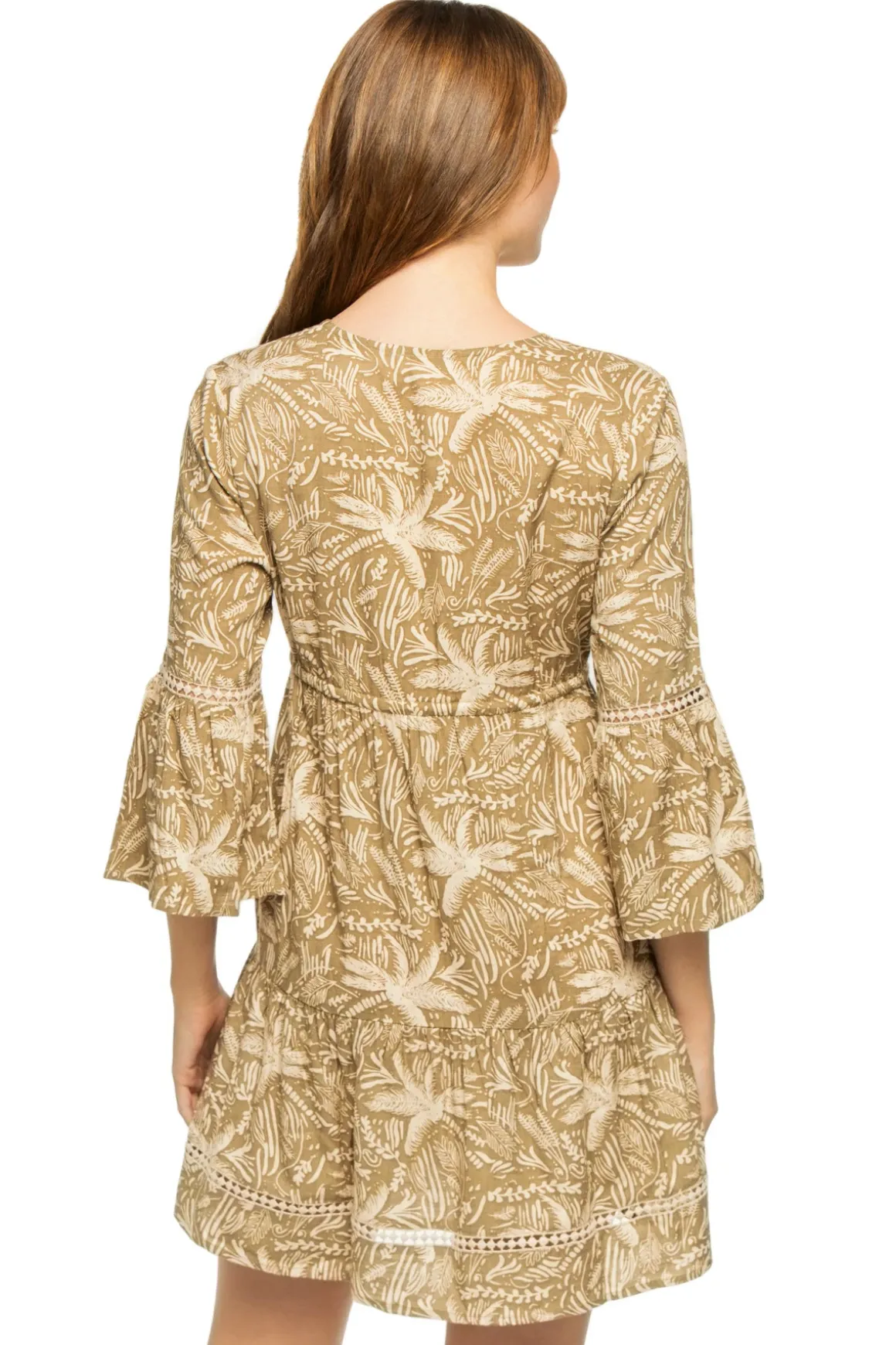 Las Palmas mini dress features swaying palm tree print and delicate lace inset trim. Offers a drawstring waist tie with tassel details.