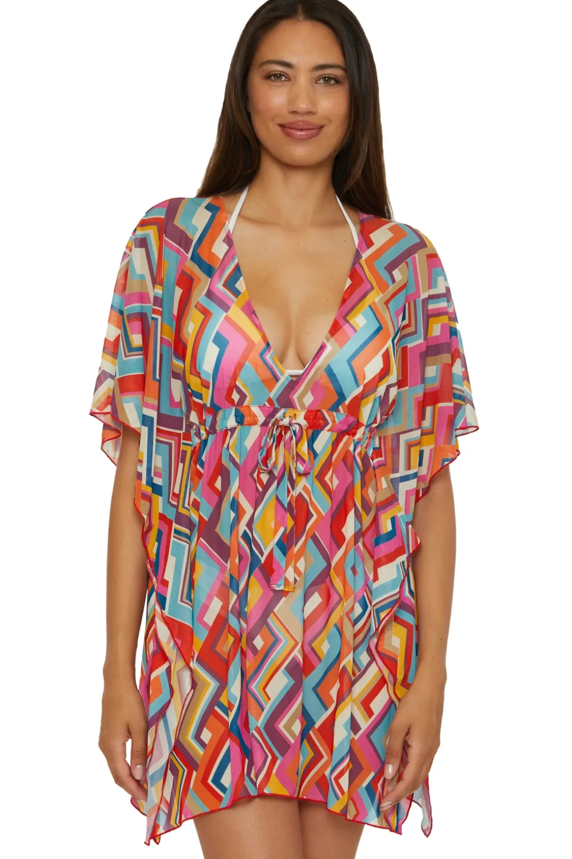 Las Palmas cover dress features metallic chevron print, angel wing sleeves and drawstring empire waist.
