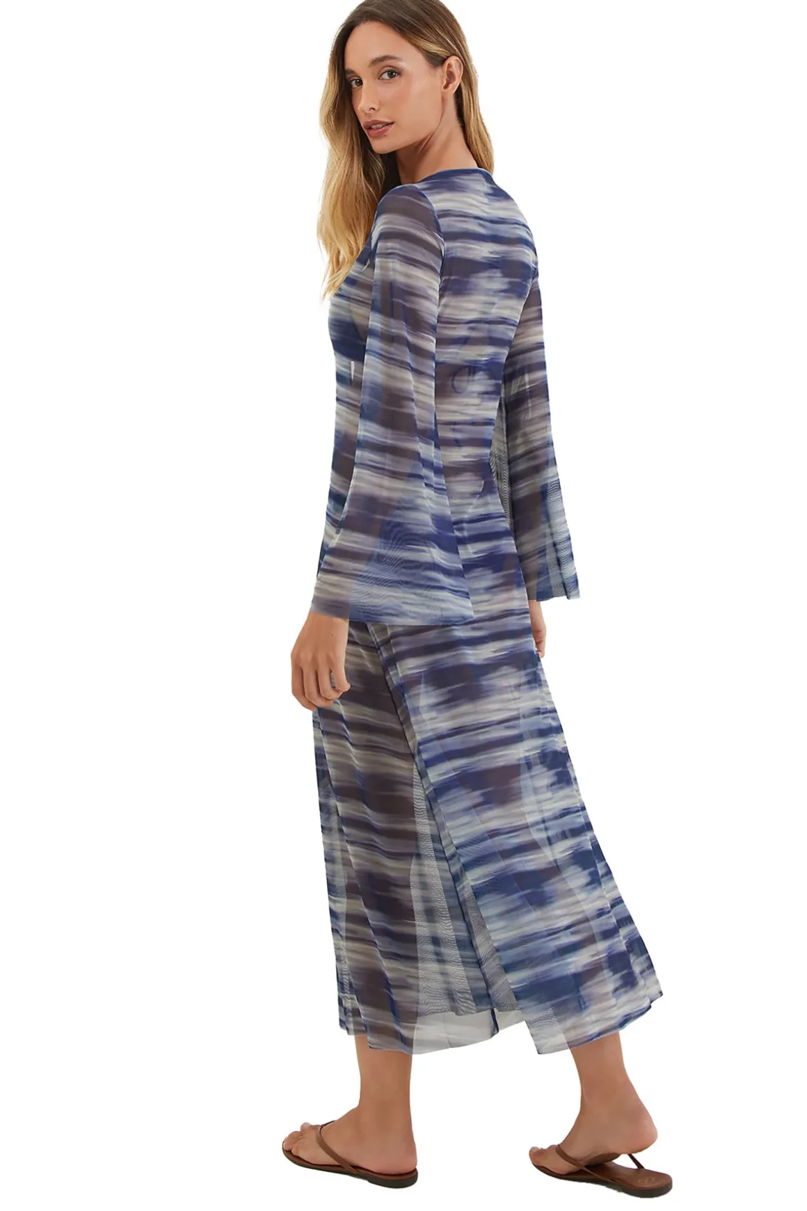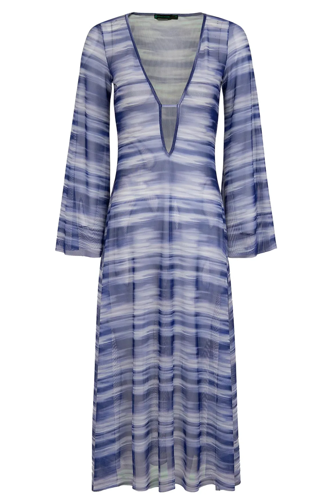 Lidi cover up dress features soft mesh fabric, plunging neckline with keyhole detail, and flared trumpet long sleeves.