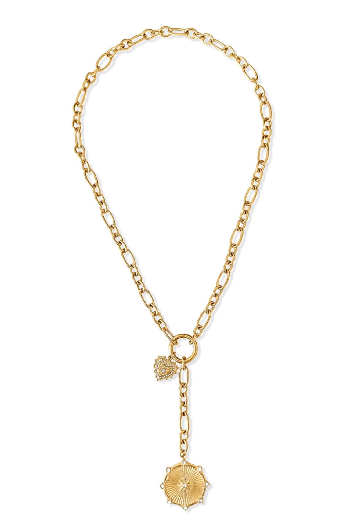 Linden lariat necklace features hypoallergenic gold plated stainless steel, a medallion pendant with cubic zirconia insets, and a toggle closure.