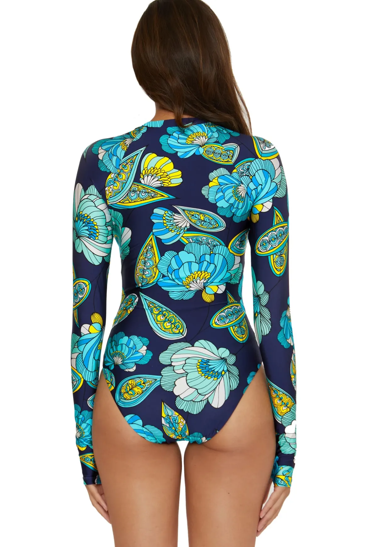 Paddle suit features a floral print and long sleeves with thumbholes. Offers a front half zipper and moderate bottom coverage.