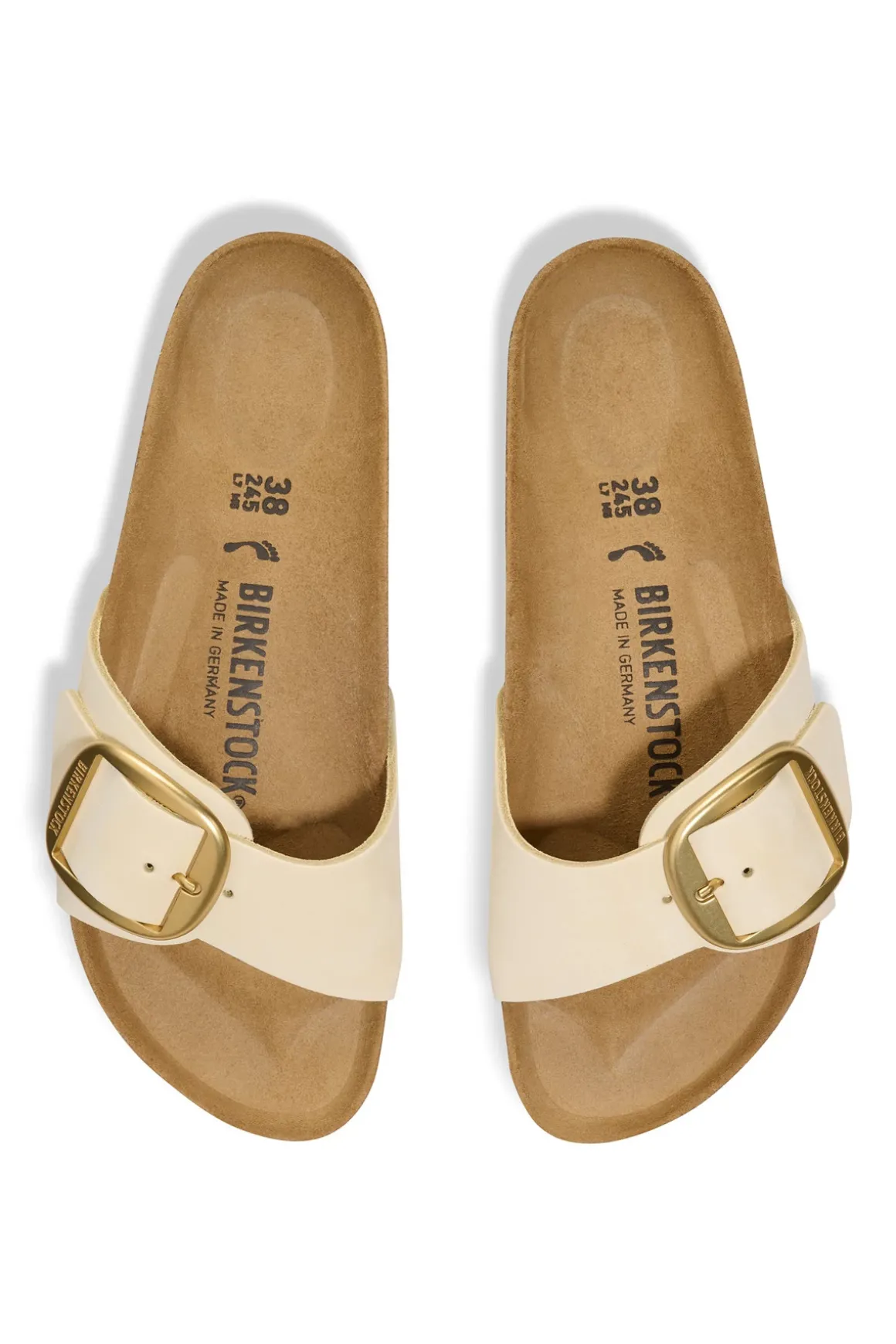 Madrid is an iconic slide featuring an amplified adjustable metal pin buckle on a nubuck leather strap, natural leather insole, and anatomically shaped cork footbed.