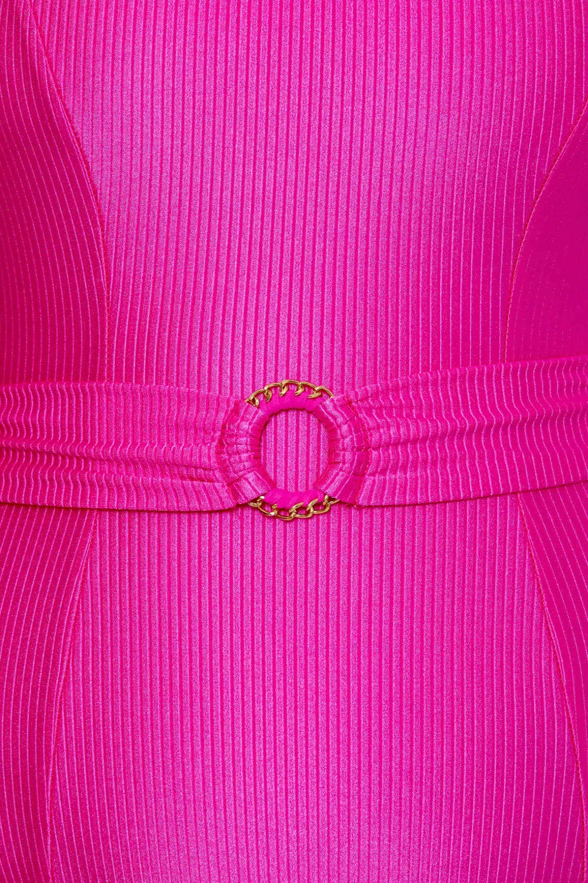Makenna shiny ribbed one piece features a scoop neckline, and a removable belt with a fabric wrapped gold chain link ring detail. Offers a built in shelf bra with removable soft cups, adjustable straps, hook back closure, and moderate bottom coverage.