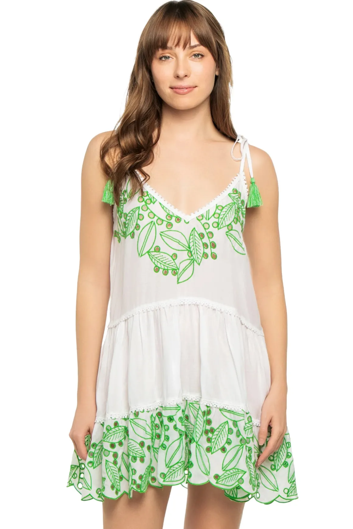 Makenzy mini dress features a deep v-neck and eyelets surrounded with embroidery details. Offers adjustable shoulder ties adorned with tassel accents.