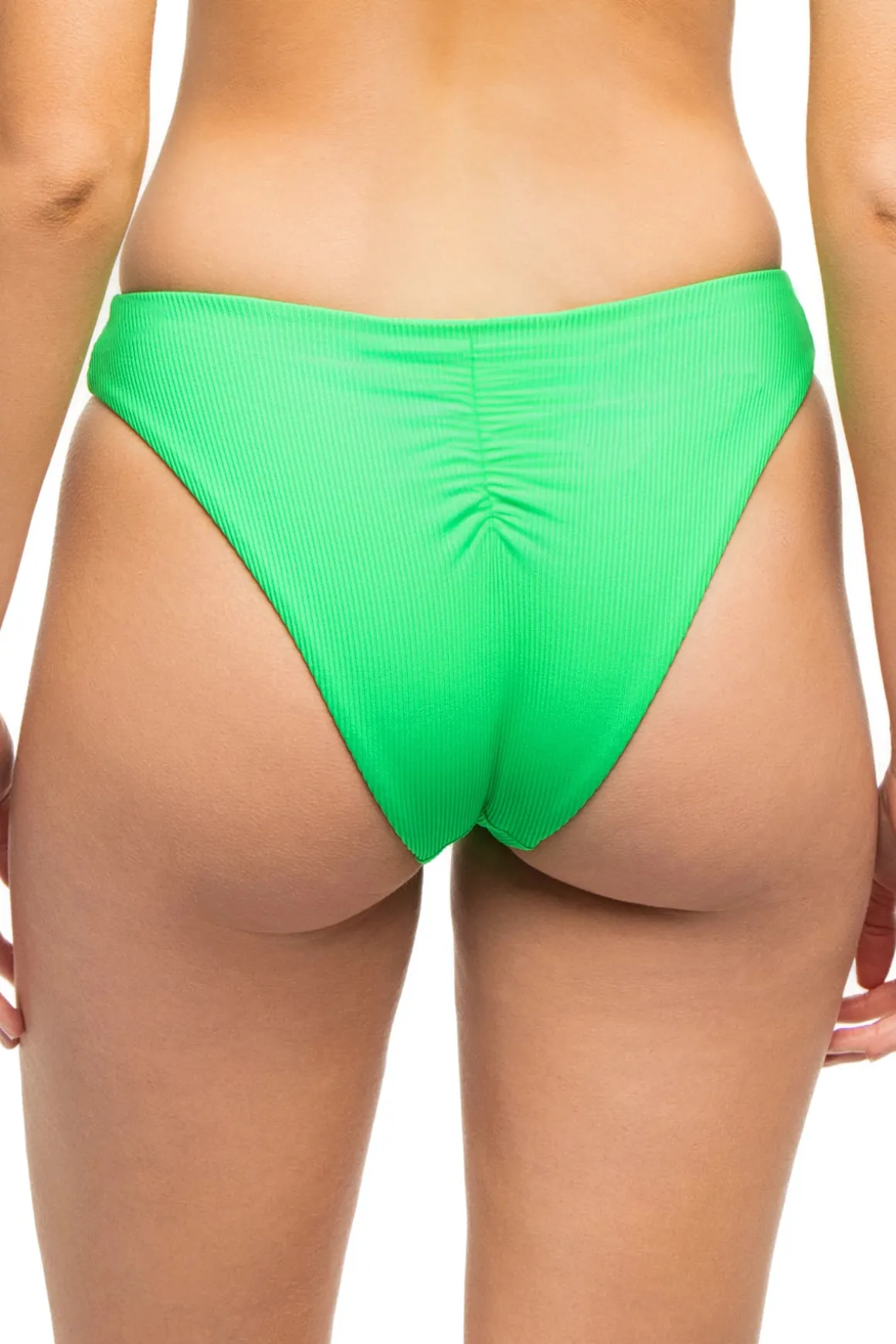 Malibu ribbed brazilian bikini bottom offers a high leg cut, v front and back, and minimal bottom coverage.