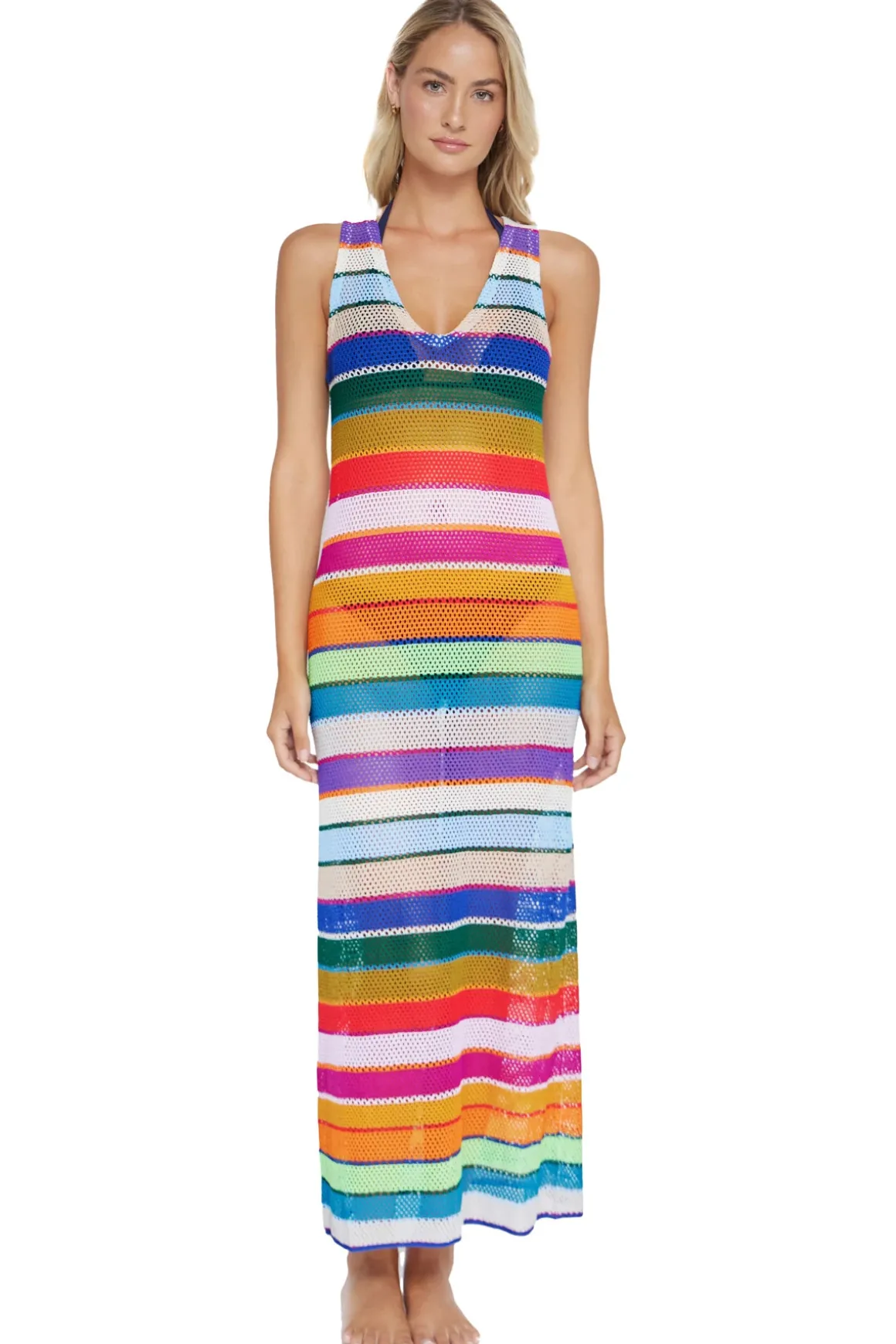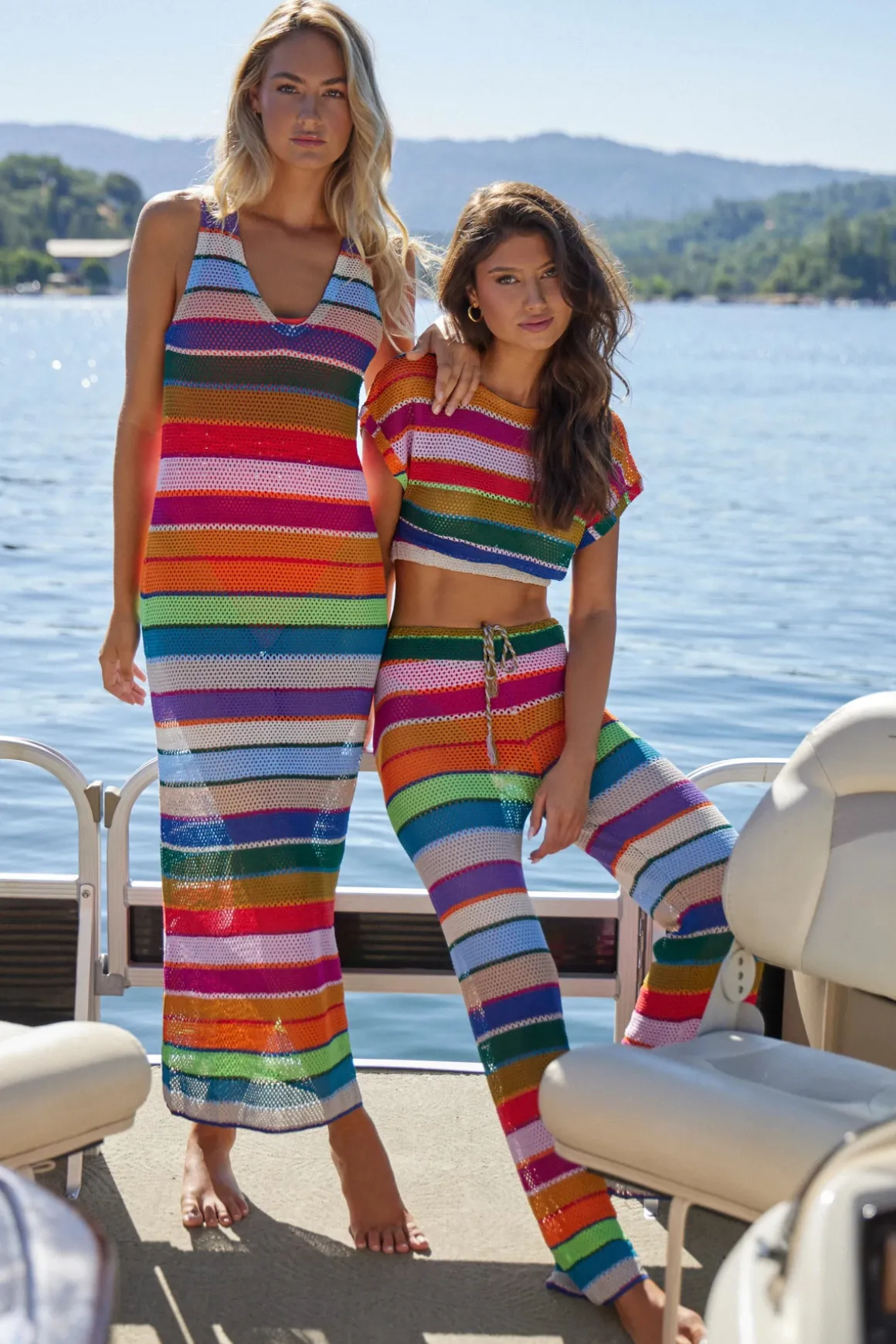 Marlo crochet midi dress is breezy and lightweight featuring a vibrant color block. Perfect for festival fashion and throwing over any swimsuit.
