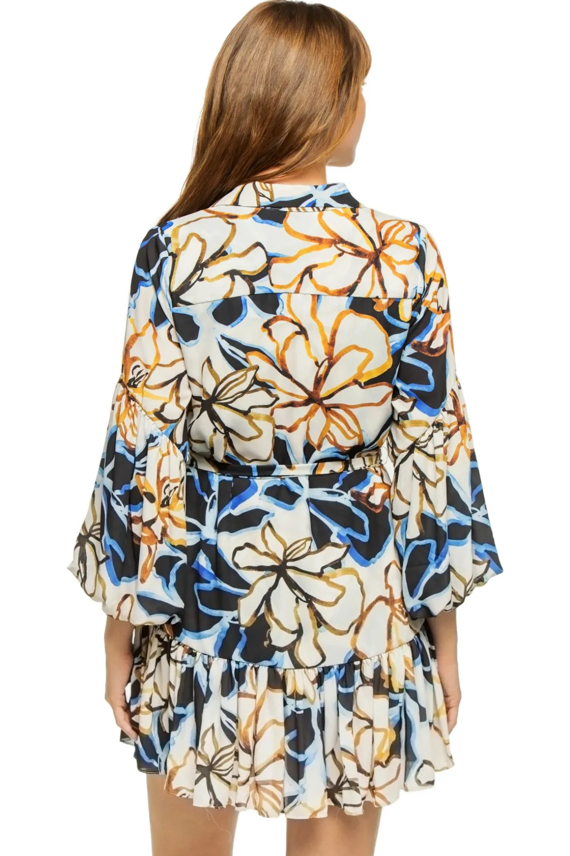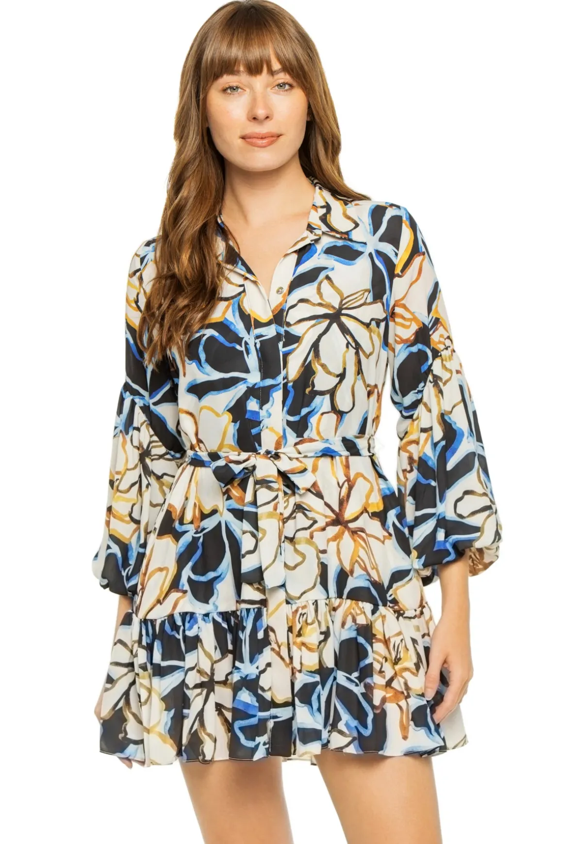 Mini dress features floral print, button-up collared neckline, 3/4 length balloon sleeves, and tiered skirt. Offers a removable waist tie.